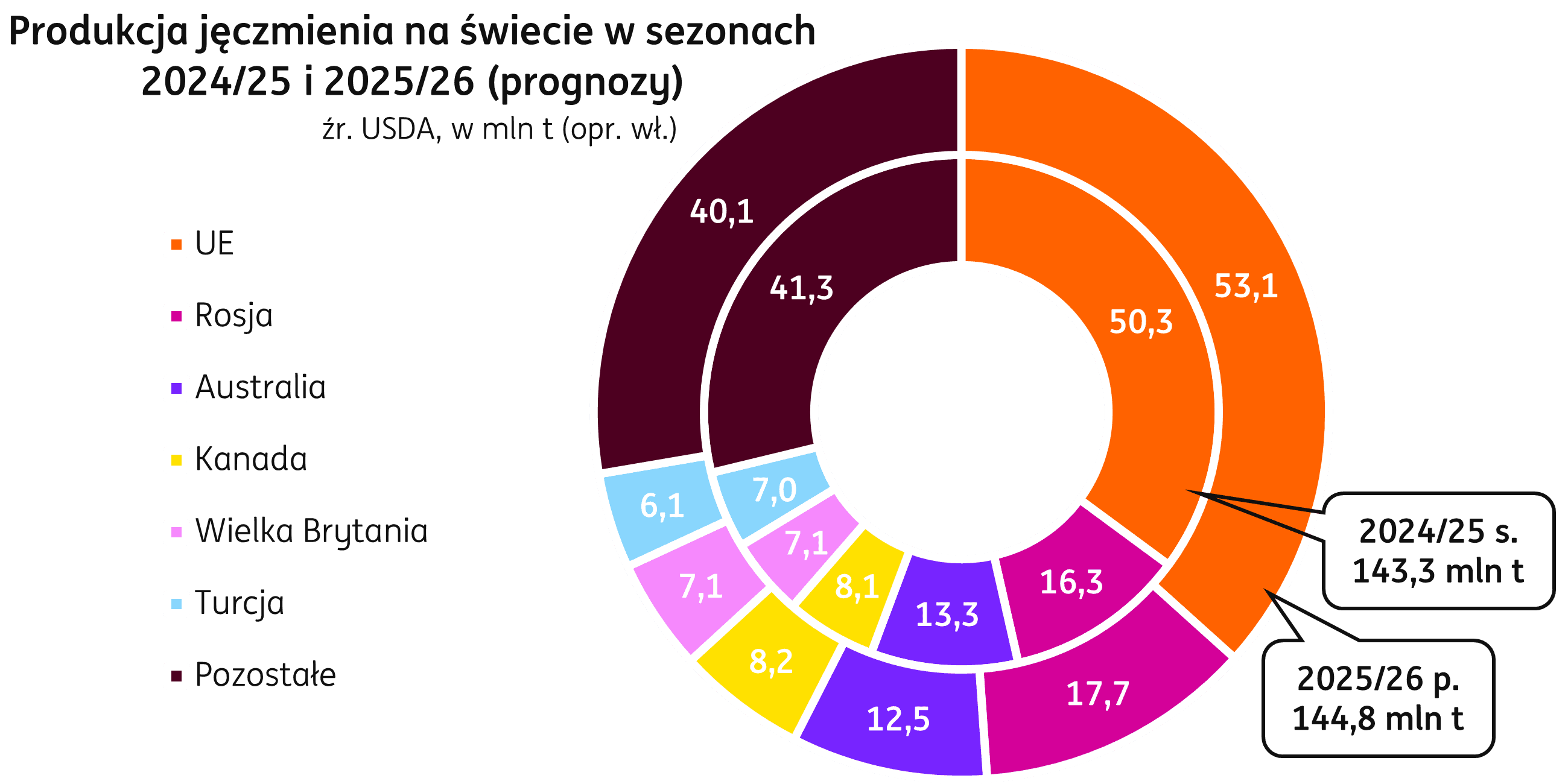Świat. W najnowszych prognozach USDA zapasy jęczmienia kończące sezon 2025/26 są prognozowane na poziomie 18,0 mln t, o 0,5 mln t niżej niż w poprzednim sezonie. Kraje Unii Europejskiej mają na koniec sezonu zgromadzić 5,8 mln t jęczmienia, co stanowi 32% światowych zapasów. Kolejne są Stany Zjednoczone z wolumenem 1,7 mln t, posiadające 9% udziału oraz Wielka Brytania z zapasami 1,3 mln t i siedmioprocentowym udziałem w globalnych zapasach końcowych.
