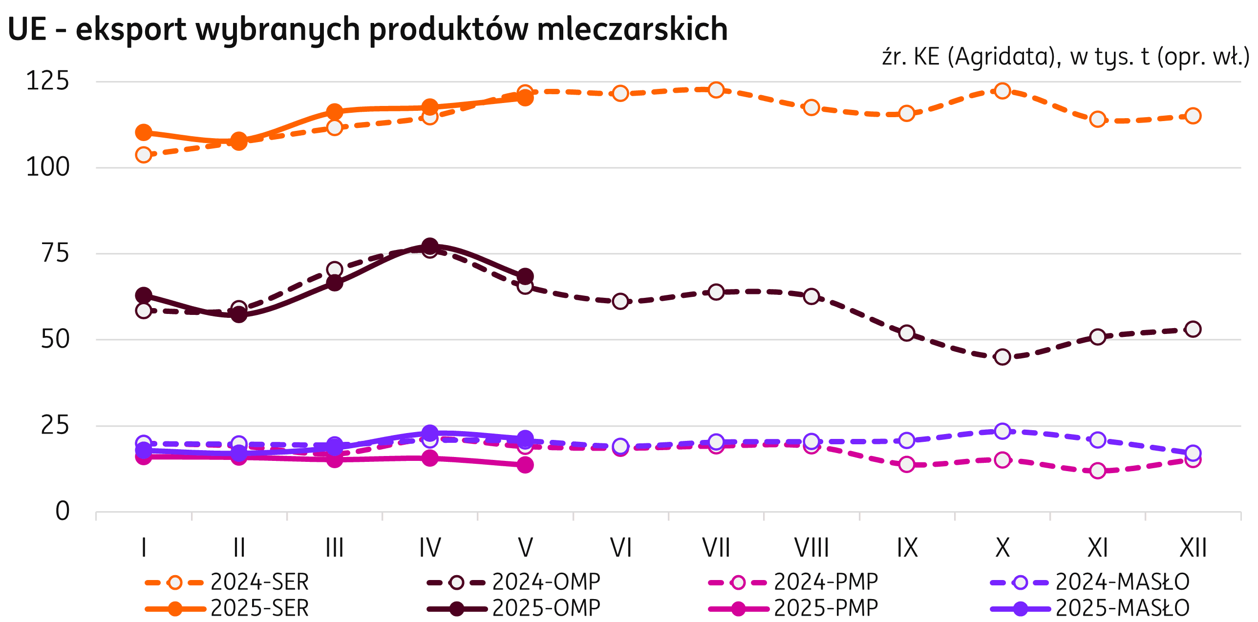 Handel. Dane KE (portal Agridata) po pięciu miesiącach 2025 r. wskazują na eksport sera poza granice UE na poziomie 572 tys. t, o 2% powyżej poziomu ubiegłorocznego z tego okresu (+13 tys. t r/r). Eksport pełnego mleka w proszku spadł do 76 tys. t (-20 tys. t; -20% r/r), natomiast odtłuszczonego osiągnął 332 tys. t, nieco powyżej poziomu notowanego w ubiegłym roku (+3 tys. t; +0,1% r/r). Spadek eksportu jest kontynuowany w przypadku masła, którego wolumen dostaw obniżył się do 98 tys. t (-3% r/r) od początku roku.
