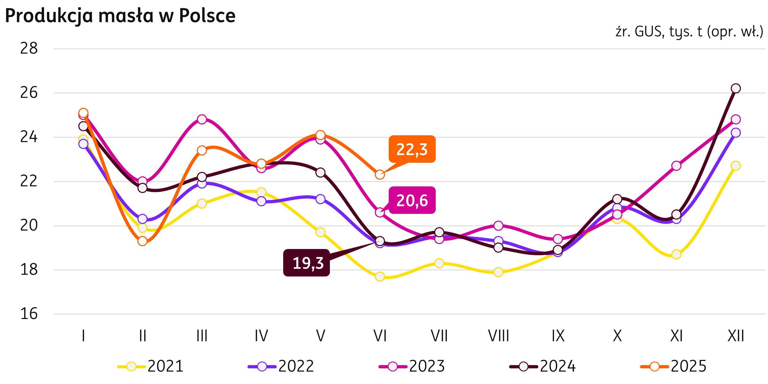 Produkcja masła. Znaczny wzrost produkcji masła w Polsce w czerwcu 2025 r., jej wolumen osiągnął 22,3 tys. t, o 16% więcej niż w czerwcu ubiegłego roku (dane z Biuletynu Statystycznego GUS). Skumulowana produkcja masła od początku roku to 137 tys. t, o 3% powyżej produkcji ubiegłorocznej (w porównaniu do IH2023, produkcja jest natomiast o 1% niższa).