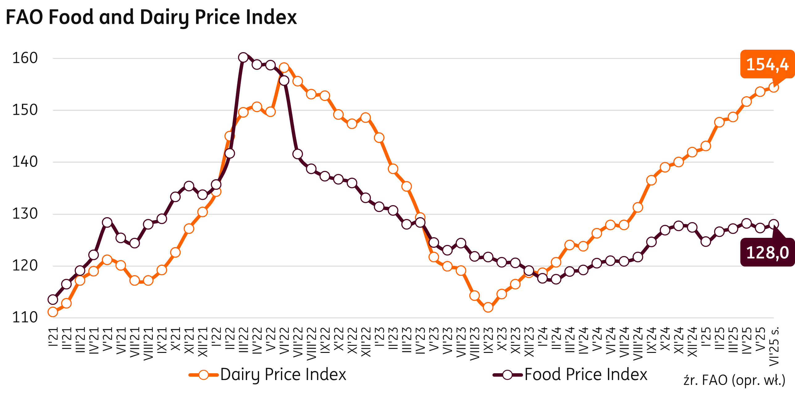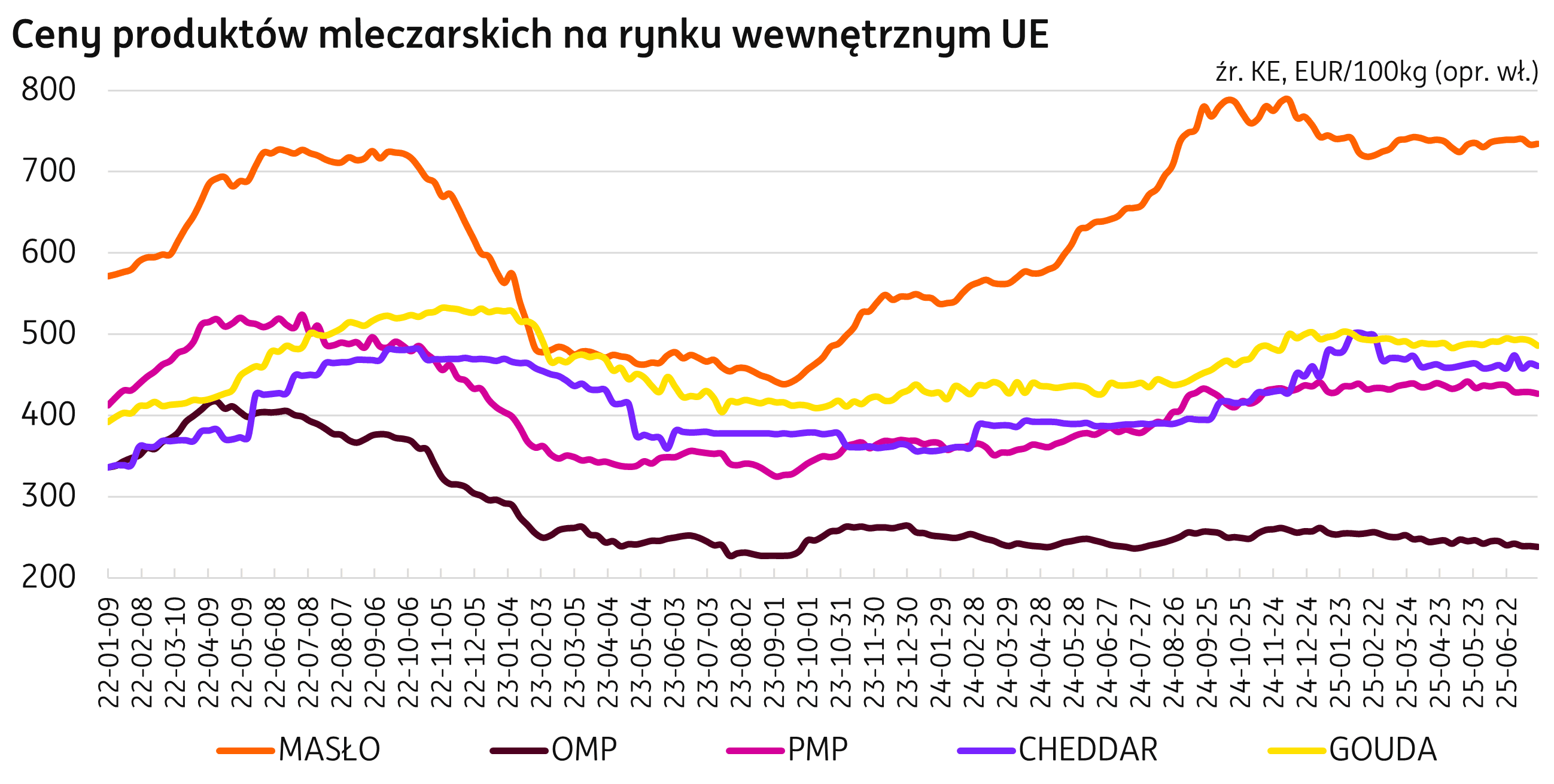 20 lipca 2025 r. ceny produktów mleczarskich na rynku wewnętrznym UE kształtowały się na następujących poziomach: masło 734 EUR/100 kg (-0,7% m/m; +12% r/r), OMP 234 EUR/100 kg (-0,8% m/m; +0,8% r/r), PMP 427 EUR/100 kg (-2% m/m; +12% r/r), ser cheddar 461 EUR/100 kg (+0,7% m/m; +19% r/r), ser gouda 486 EUR/100 kg (-2% m/m; +11% r/r), serwatka w proszku 94 EUR/100 kg (-2% m/m; +18% r/r).