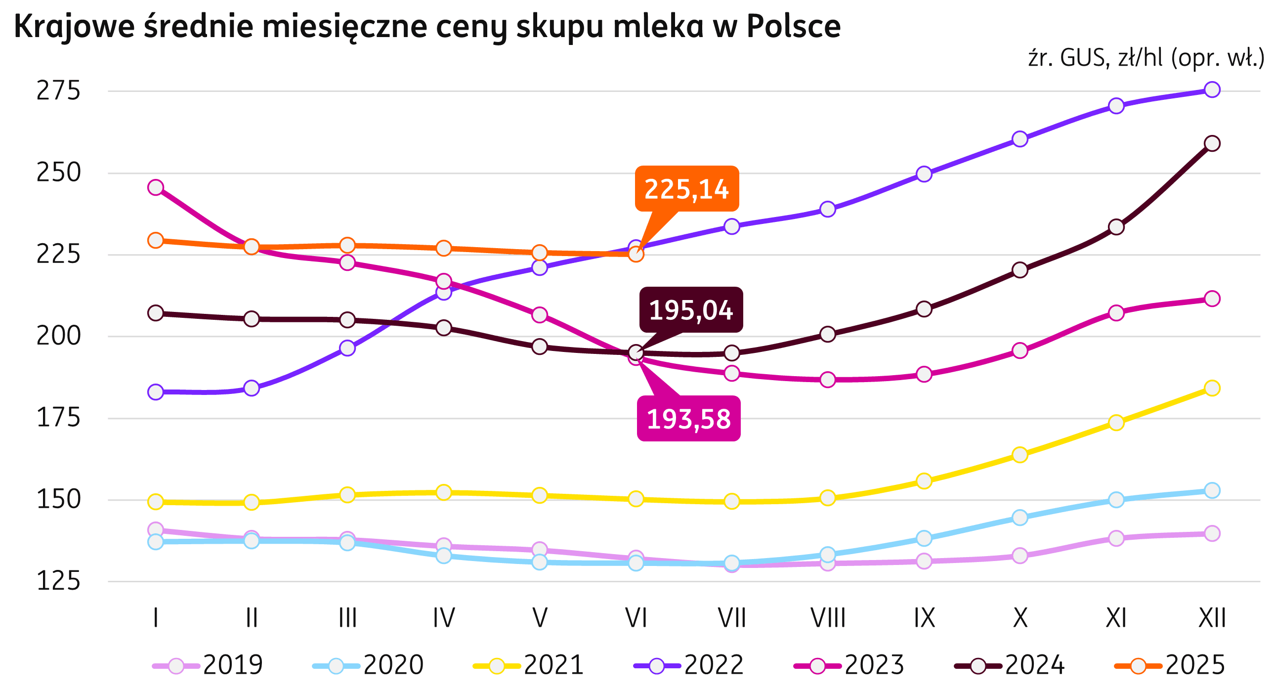 Ceny. W czerwcu 2025 r. ceny mleka w polskich skupach spadły do średniej 225,14 zł za hektolitr, to o 0,51 zł/hl mniej niż w poprzednim miesiącu (dane wg Biuletynu Statystycznego GUS). W zestawieniu z ubiegłym rokiem cena mleka utrzymuje się 15% powyżej notowanej w czerwcu 2024 r. (+30,10 zł/hl r/r).