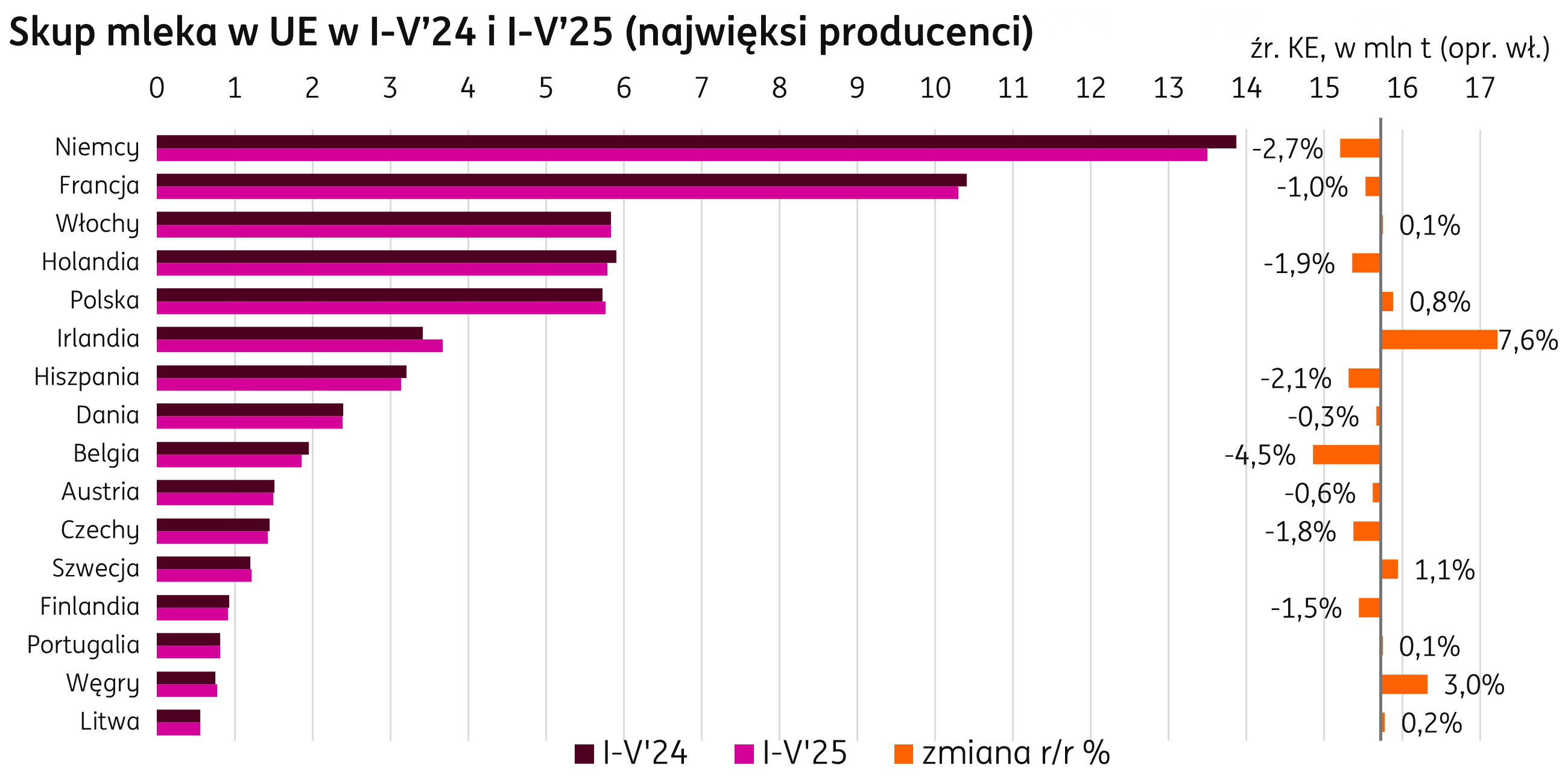 Produkcja mleka. Po pięciu miesiącach 2025 r. skup mleka w krajach Unii Europejskiej spadł do poziomu o 0,5 mln t niższego w porównaniu do analogicznego okresu ubiegłego roku, osiągając 62,1 mln t (-0,8% r/r). Wśród krajów Unii Europejskiej największy wolumenowo spadek zaliczyły Niemcy, produkcja obniżyła się tam o 0,4 mln t (-3% r/r). Sporo spadła również produkcja we Francji (-0,1 mln t; -1% r/r) oraz w Holandii (-0,1 mln t; -2% r/r). Największy wzrost w analizowanym okresie osiągnęła Irlandia, o 0,3 mln t (+8% r/r), a skup mleka w Polsce zwięszył się o 45 tys. t (+0,8% r/r).