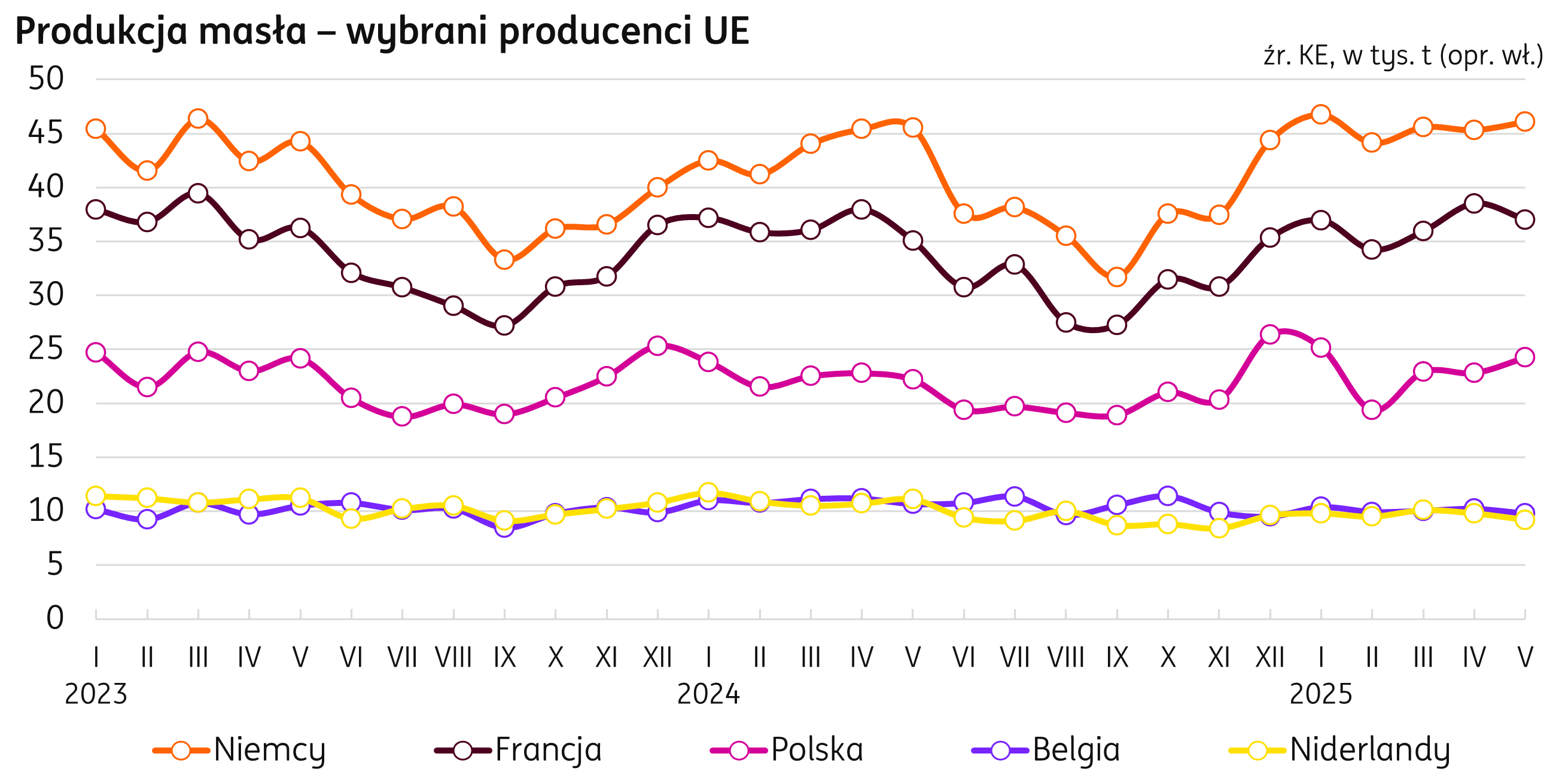 Produkcja masła utrzymuje nieznaczny wzrost w relacji rocznej także po spływie danych za kwiecień (raporty KE), łącznie od początku roku 2025 produkcja masła przez raportujące kraje Unii Europejskiej to 829 tys. t, o 9 tys. t więcej niż w analogicznym okresie ubiegłego roku (+1,1% r/r). Należy zwrócić uwagę, że od raportu obejmującego dane kwietniowe, nie są publikowane informacje o produkcji masła w Irlandii, będącej trzecim pod względem wolumenu producentem masła w UE w 2024 r. (268 tys. t w 2024 r., 13% produkcji UE). Za wzrost produkcji odpowiedzialne są głównie Niemcy, wolumen produkcji masła od początku roku wzrósł w tym kraju o 9,2 tys. t (+4% r/r), istotnie produkcję zwiększono również we Włoszech (+3,0 tys. t, +7% r/r) oraz w Hiszpanii (+3,0 tys. t, +37% r/r). Pozwala to skompensować z nadwyżką spadki produkcji w takich krajach, jak Holandia (-6,5 tys. t, -12% r/r), czy Belgia (-4,4 tys. t, -8% r/r). Polska produkcja kształtowała się w tym okresie o 1,7 tys. t powyżej poziomu ubiegłorocznego (+1% r/r).