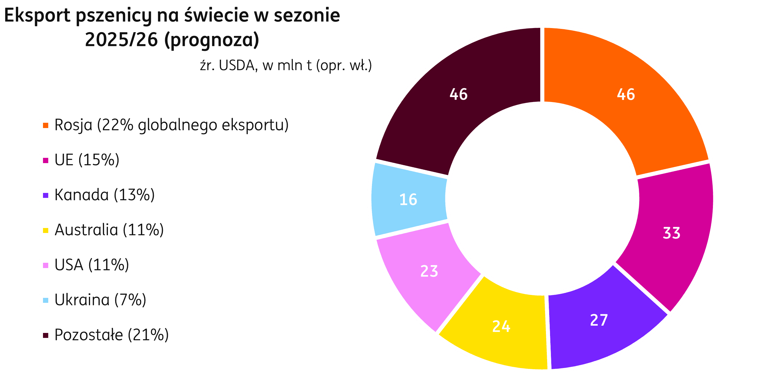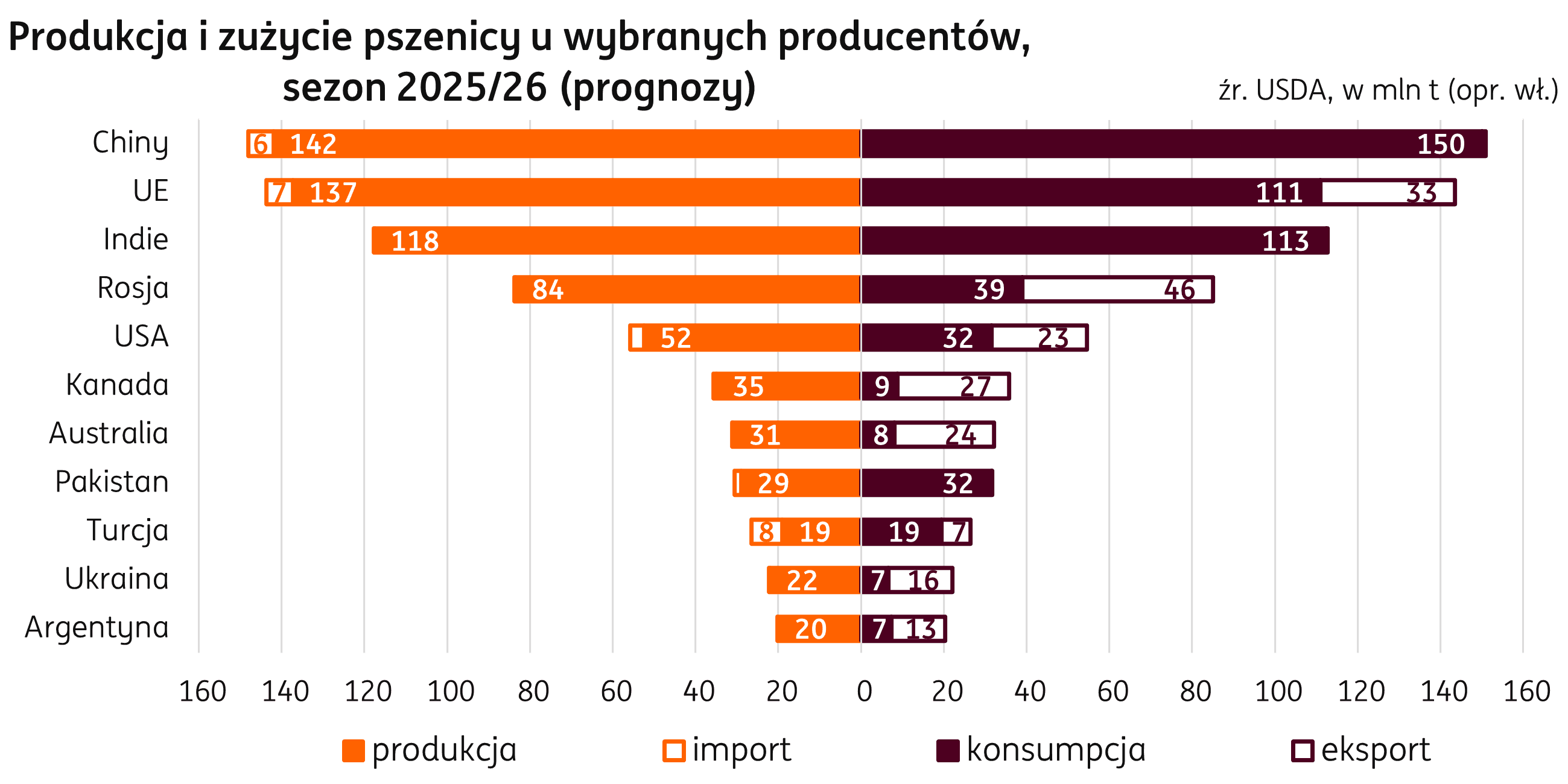 Świat. Globalna produkcja pszenicy w sezonie 2025/26 w raportach Departamentu Rolnictwa Stanów Zjednoczonych (USDA) pozostała w ich lipcowej edycji na poziomie 808,6 mln t, o 8,6 mln t powyżej zbiorów z sezonu 2024/25 (+1,1% r/r). W porównaniu do prognoz czerwcowych doszło do podniesienia przewidywanego poziomu produkcji w Kazachstanie (+1,0 mln t p/p), w Unii Europejskiej (+0,7 mln t p/p) oraz w Rosji (+0,5 mln t p/p). Skorygowano natomiast przewidywany poziom zbiorów w Kanadzie (-1,0 mln t p/p) oraz na Ukrainie (-1,0 mln t p/p).