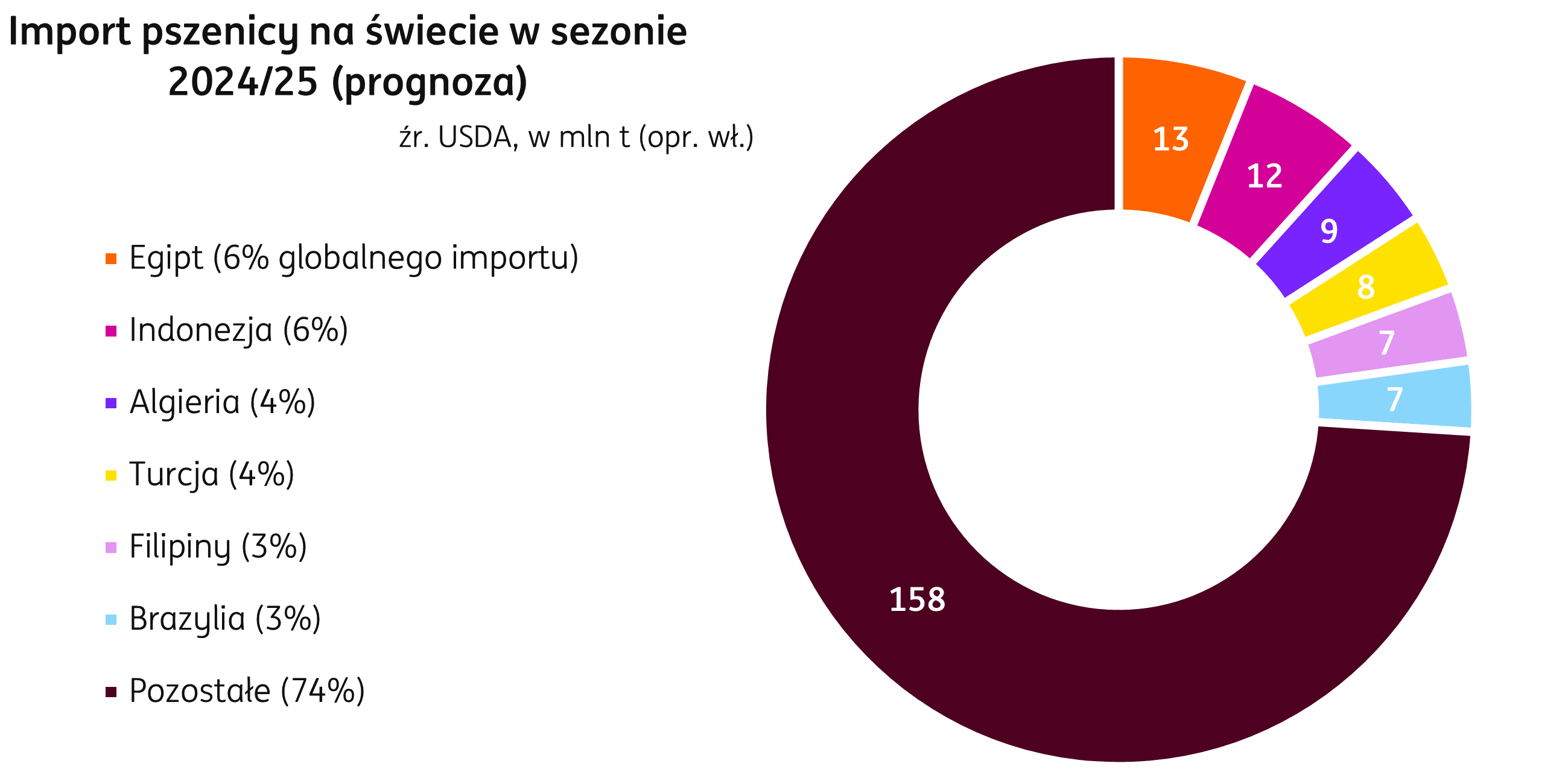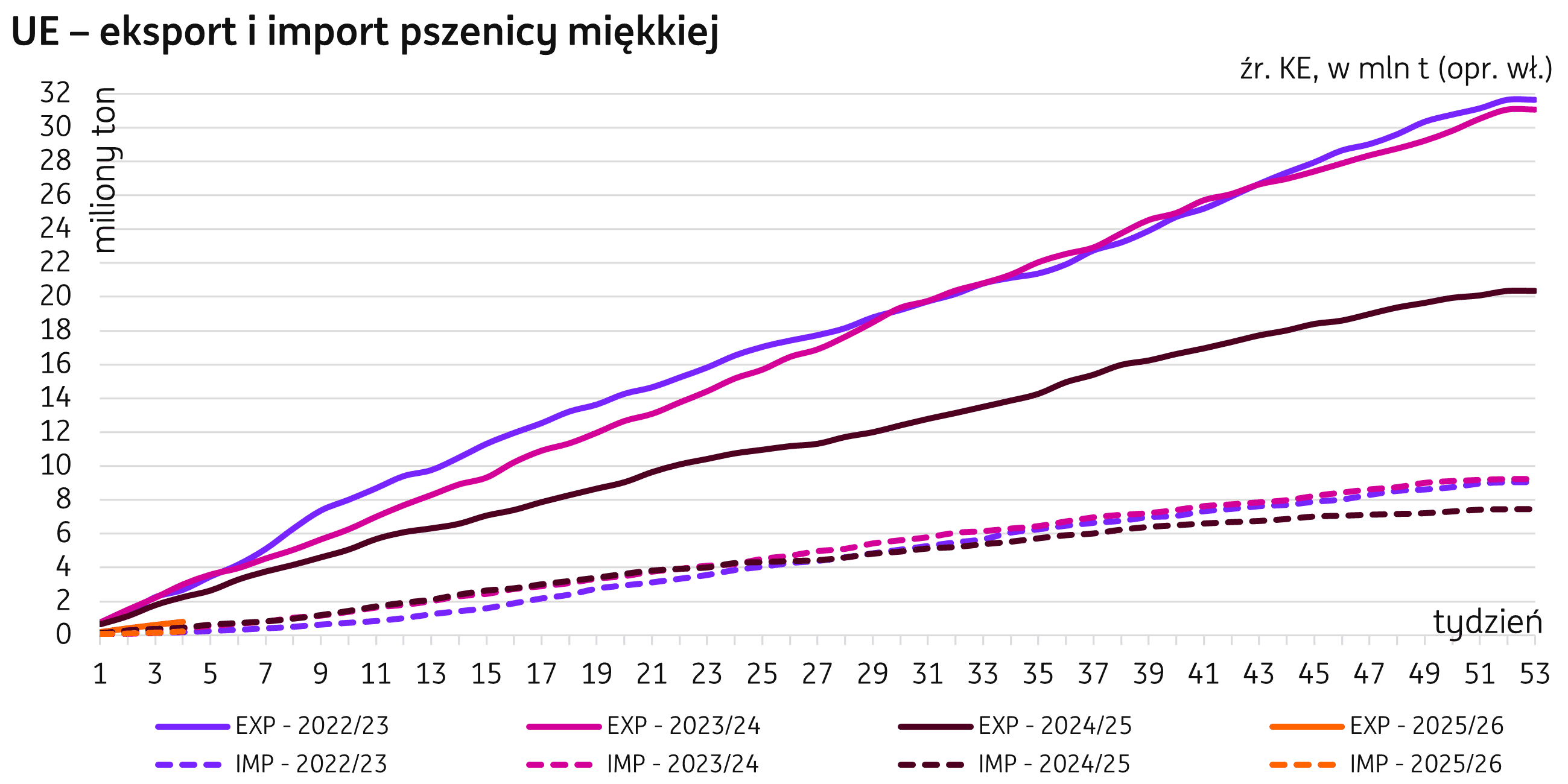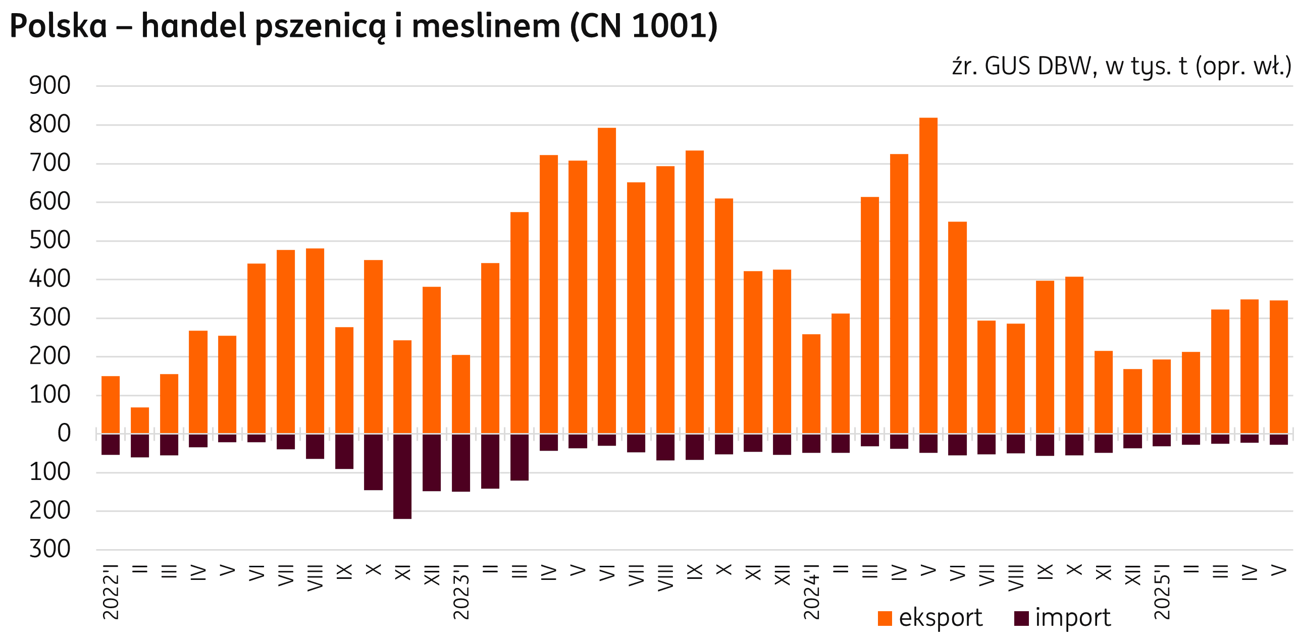 Unia Europejska. W zakończonym sezonie 2024/25 eksport pszenicy z krajów Unii Europejskiej został podsumowany na poziomie 20,3 mln t o 35% poniżej wyniku ubiegłorocznego (-10,7 mln t r/r; wstępne dane opublikowane przez KE), natomiast import osiągnął 7,4 mln t, spadając o 19% r/r (-1,8 mln t r/r). Nowy sezon handlowy rozpoczął się eksportem 803 tys. t pszenicy w okresie 1.07.-27.07.2025 r., to spadek o 64% r/r (-1 446 tys. t r/r). Dwa główne kierunki w tym okresie to Nigeria (93 tys. t, -63% r/r) i Algieria (93 tys. t, +51% r/r). Import po czterech tygodniach bieżącego sezonu to 218 tys. t, o 53% niższy w relacji rocznej (-246 tys. t r/r). 39% importowanej w tym okresie pszenicy pochodziło z Kanady (86 tys. t; +42% r/r), a 23% z Ukrainy (50 tys. t, -83% r/r).