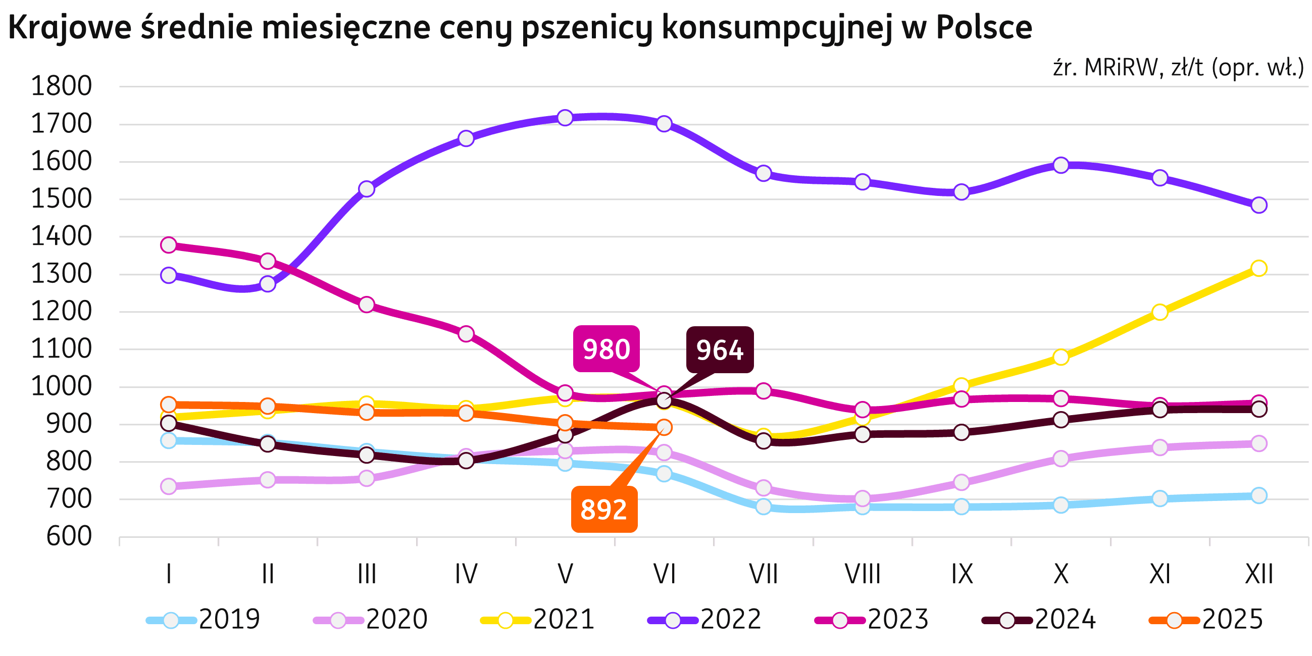 Cena. Czerwcowa średnia cena pszenicy konsumpcyjnej w Polsce, według Biuletynu MRIRW, zanotowała miesięczny spadek w wysokości 1,2% m/m, osiągając 892 zł/t i kształtowała się o 7% poniżej ceny sprzed roku (-72 zł/t r/r). Na rynku krajowym w tygodniu kończącym się 27 lipca 2025 r. średnie ceny pszenicy konsumpcyjnej kształtowały się w przedziale 744-894 zł/t.