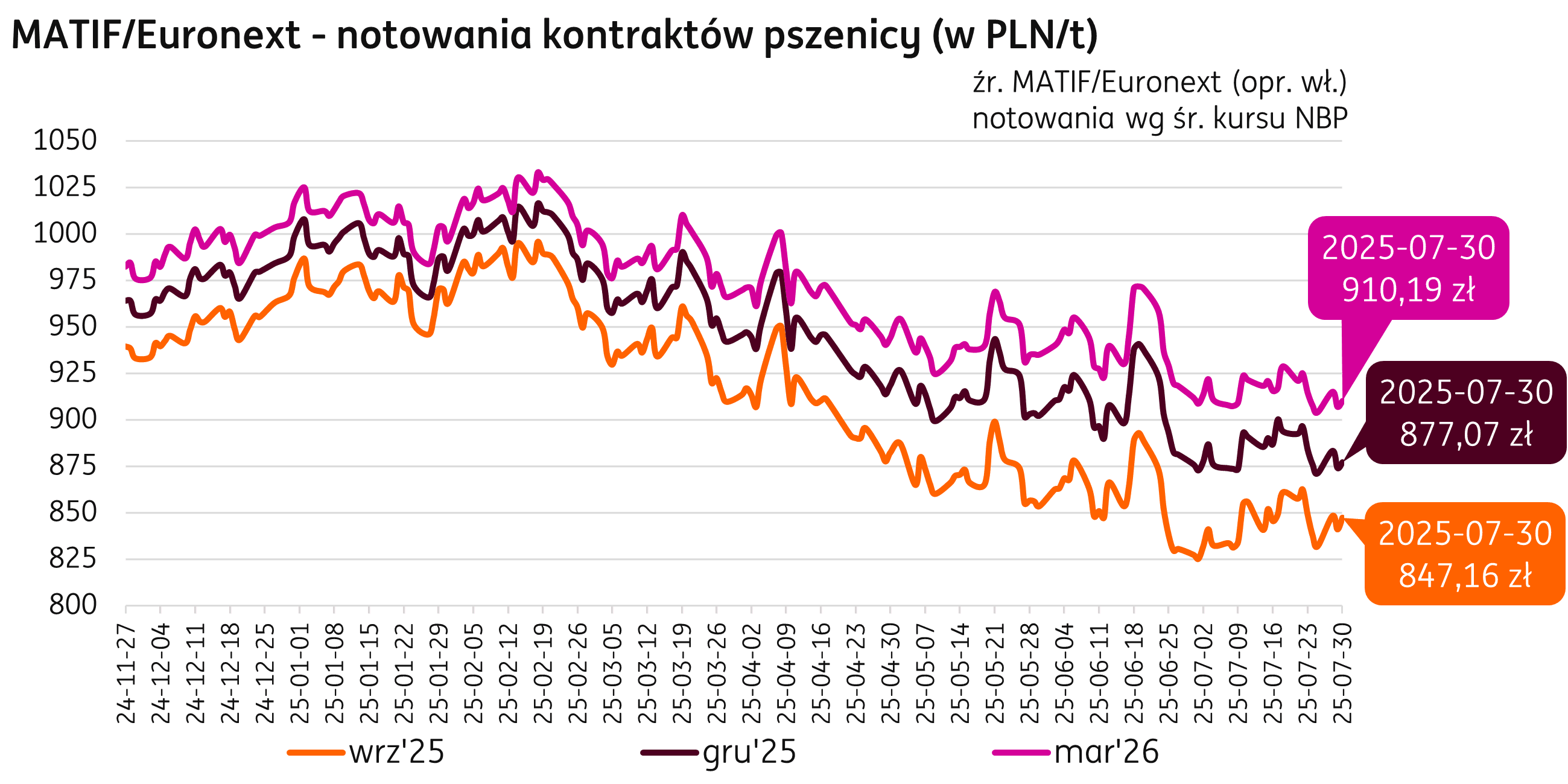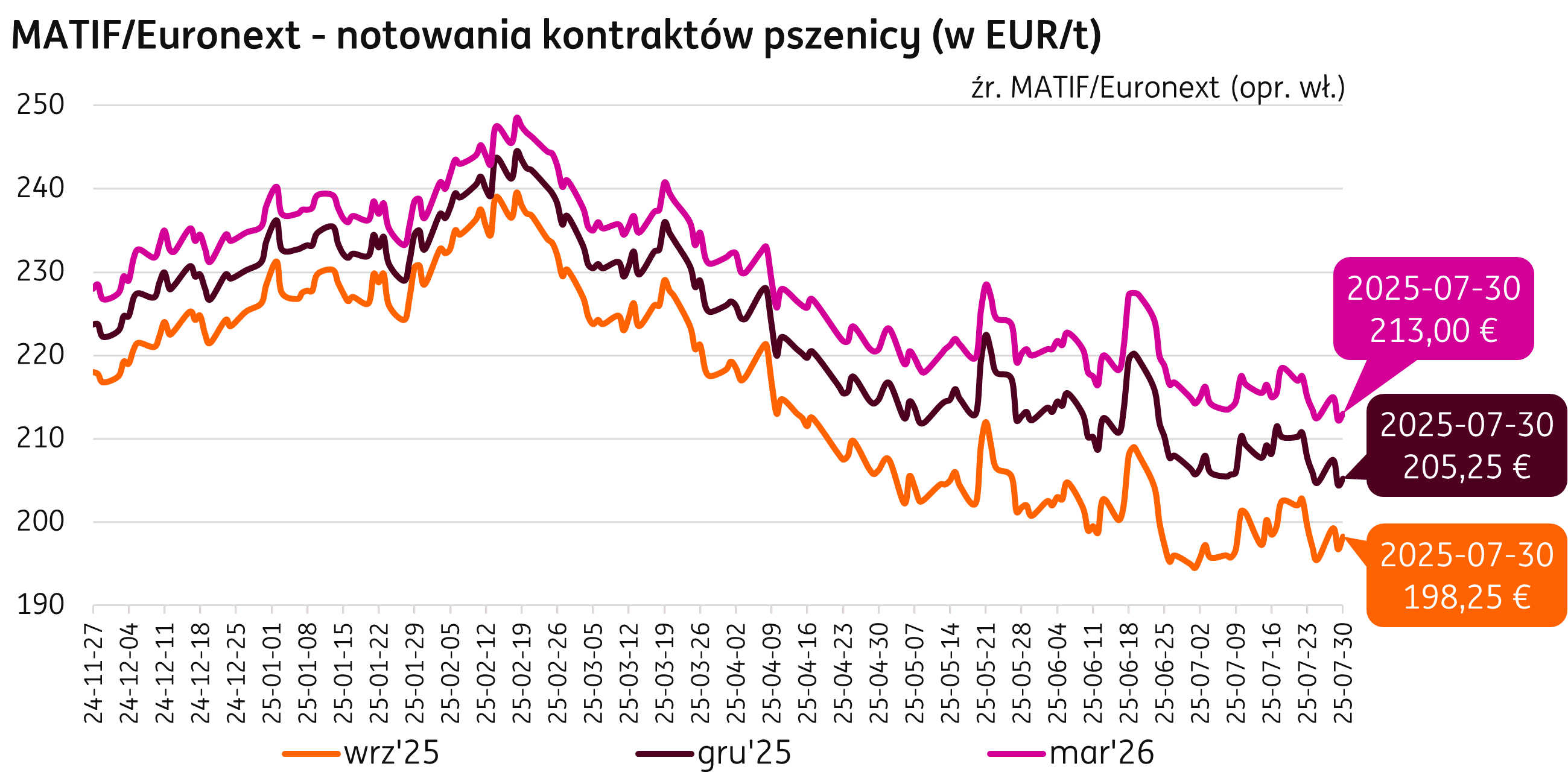 Cena wrześniowego kontraktu pszenicy na giełdzie Euronext/MATIF zamknęła się 30 lipca 2025 r. na poziomie 198,25 EUR/t, co oznacza wzrost o 3,25 EUR/t w porównaniu do poprzedniego miesiąca (+1,7% m/m). Kontrakt grudniowy był notowany na poziomie 205,25 EUR/t (-0,6% m/m), natomiast marcowy na poziomie 213,00 EUR/t (-0,9% m/m).