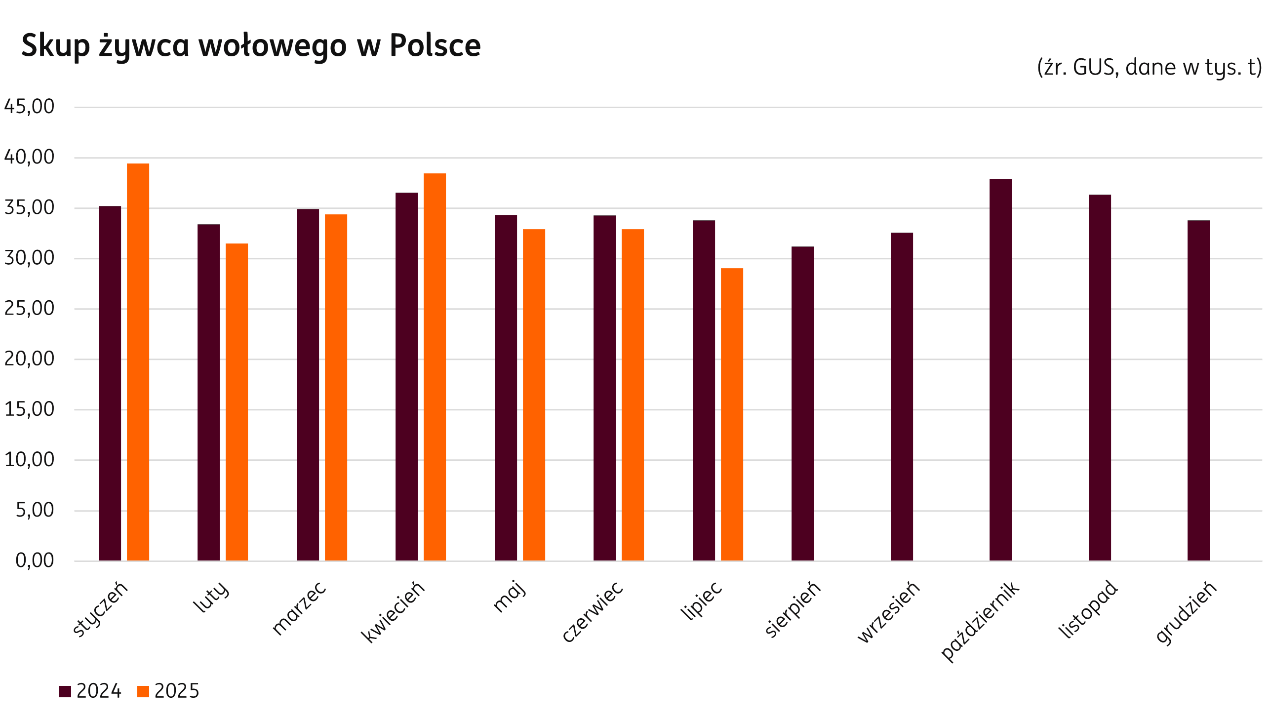 Skup w Polsce: Początek 2025 r. utrzymywał wyższy wolumen w porównaniu ze startem w 2024 r. Jednak w końcówce II kw. 2025 r. trend osłabł. W całym pierwszym półroczu 2025 r. i lipcu wartość skupu bydła w kraju zbliżyła się do 239 tys. t. To o 1,6% mniej niż w analogicznym okresie ubiegłego roku.
