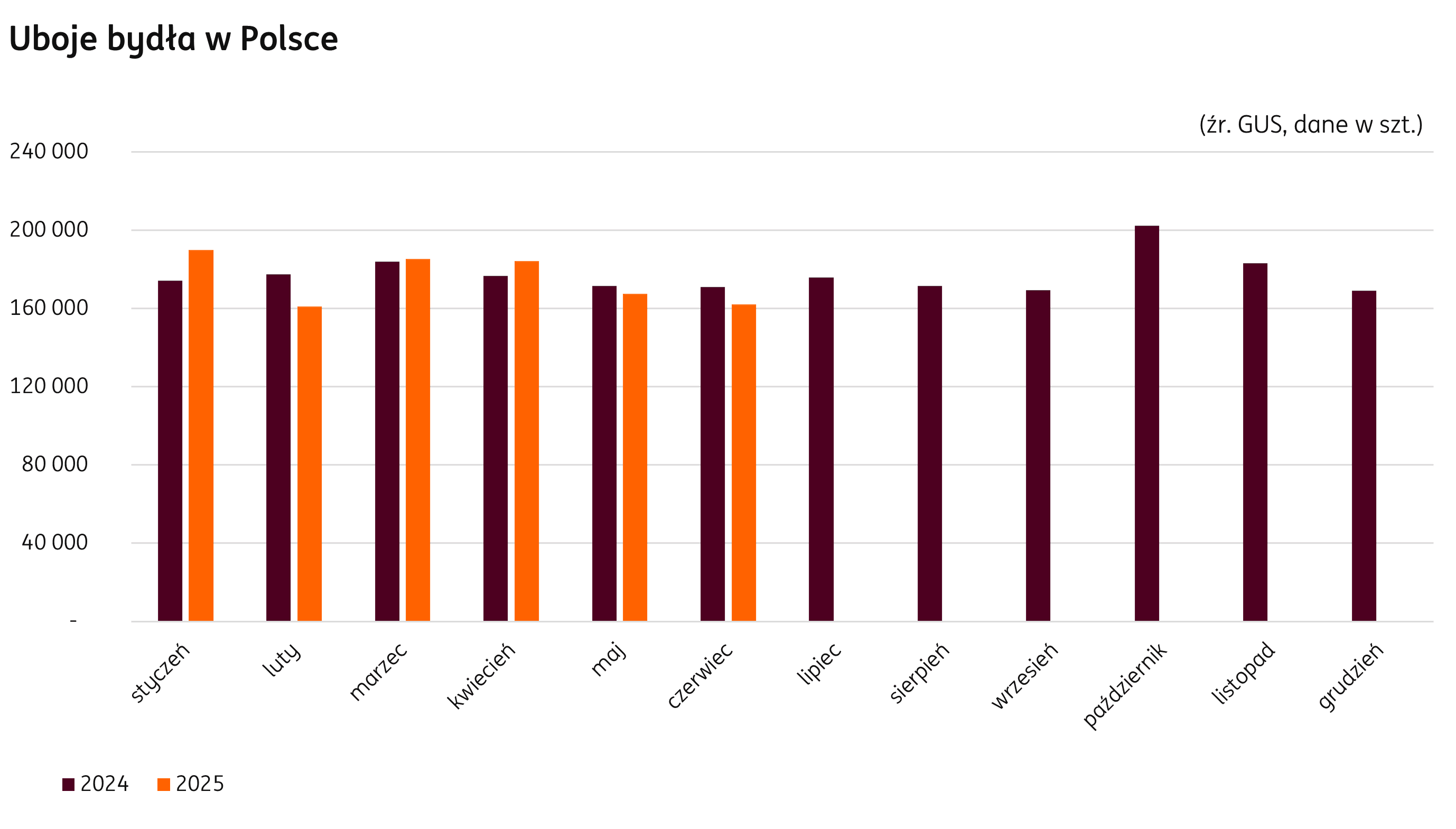 Uboje w Polsce: Tempo ubojów wyraźnie osłabło. Według wstępnych danych GUS wartość w pierwszym półroczu 2025 r. przekroczyła poziom 1 050 tys. szt. W stosunku do analogicznego okresu 2024 r. wartość jest o niespełna 0,5% niższa.