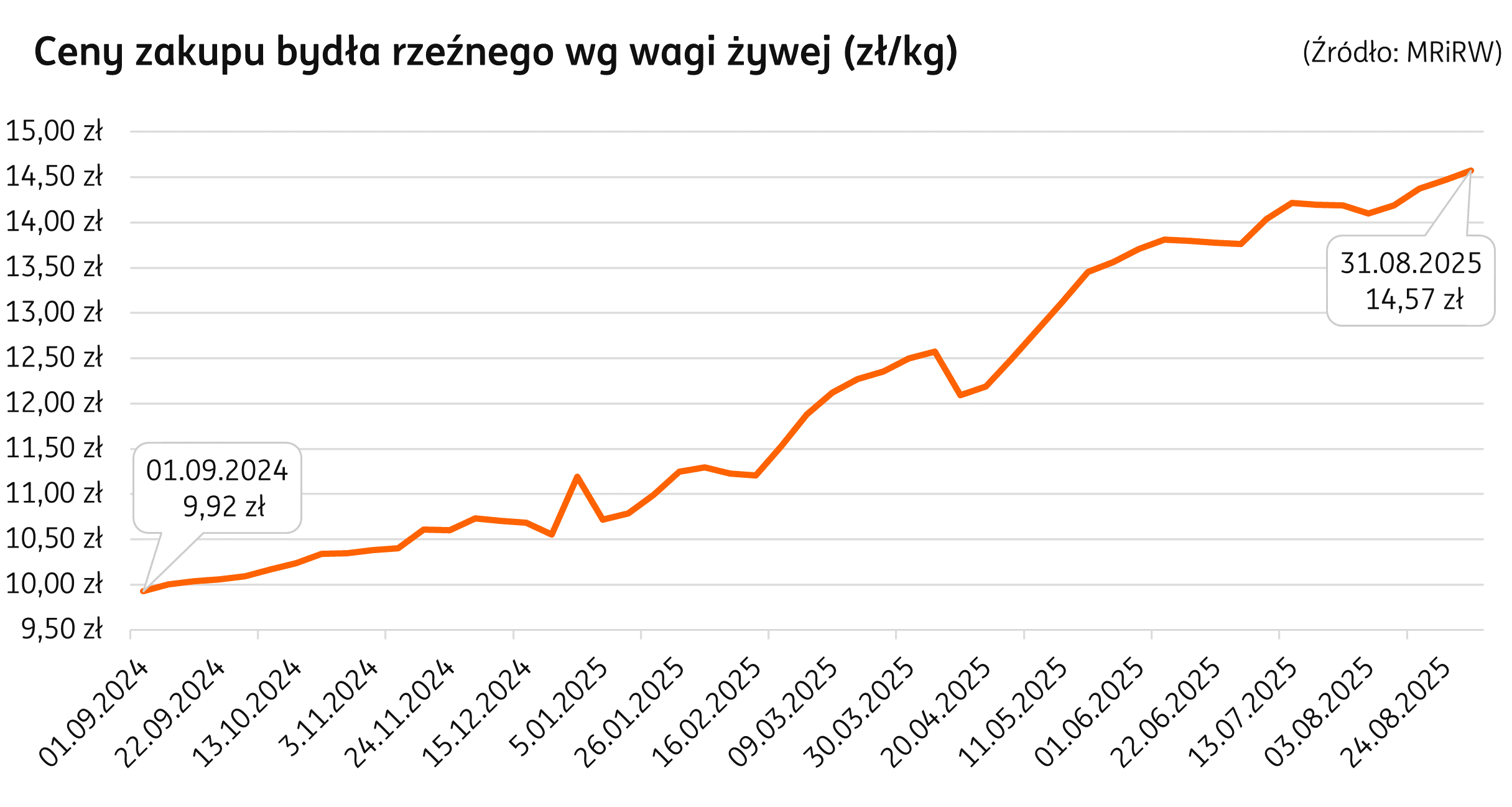 Ceny żywca wołowego kontynuują trend wzrostowy i osiągają kolejne maksima cenowe. Wynika to między innymi z ograniczonej podaży. Wskazuje na to opracowanie Głównego Urzędu Statystycznego, zgodnie z którym według stanu na czerwiec 2025 r. pogłowie bydła zmniejszyło się o 3% r/r do ponad 6,1 mln szt. Redukcji podlegały wszystkie grupy wiekowe zwierząt. Największy udział w strukturze mają cielęta poniżej 1 roku. Niemal 20% wszystkich sztuk bydła koncentruje się w województwie wielkopolskim.