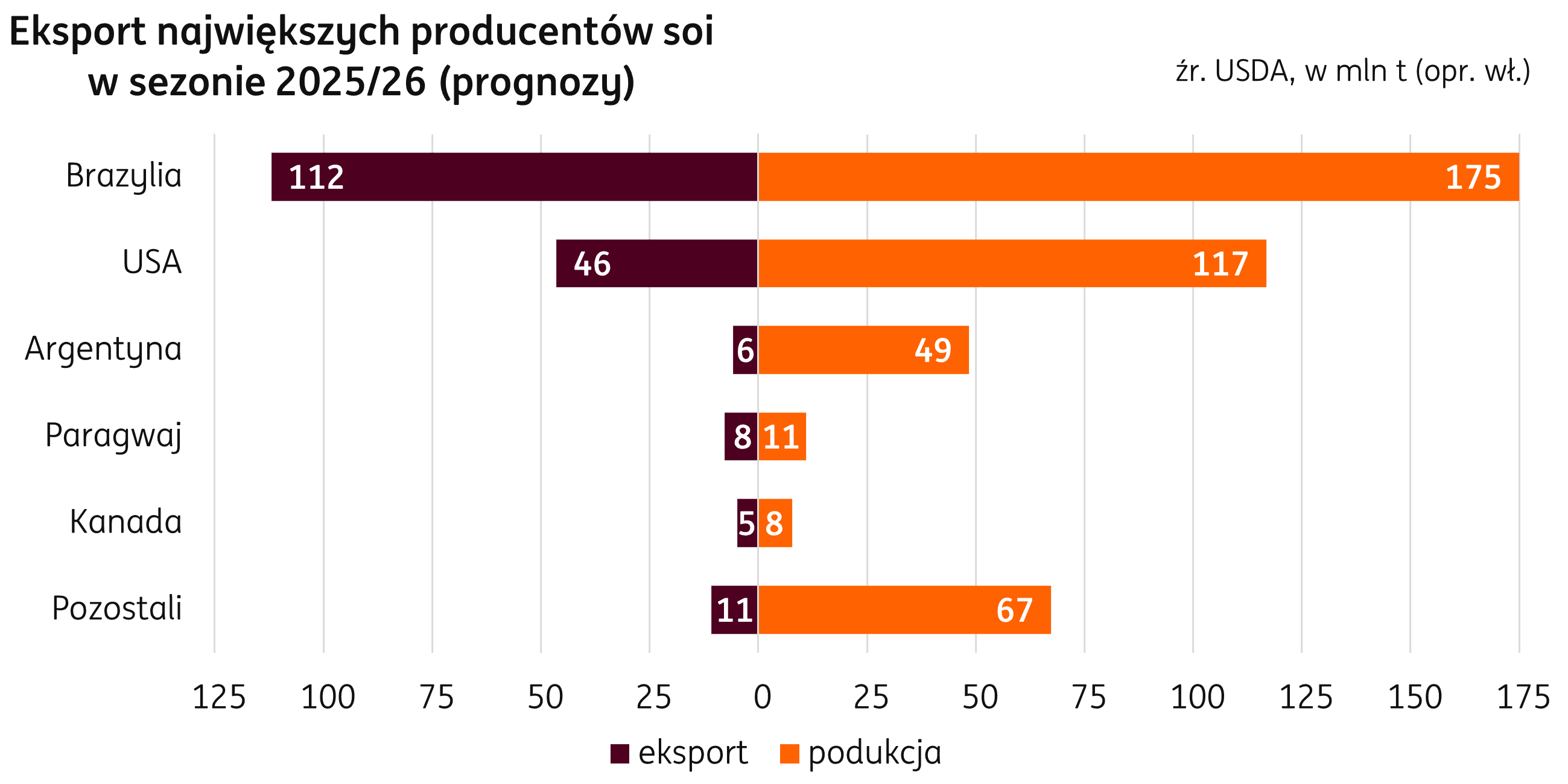 Produkcja soi na świecie. W raportach Departamentu Rolnictwa Stanów Zjednoczonych (USDA) produkcja soi w sezonie 2025/26 została w sierpniu skorygowana w przypadku Stanów Zjednoczonych o 1,2 mln t w porównaniu do prognoz ubiegłomiesięcznych i ma osiągnąć poziom 116,8 mln t (-1,7% r/r). Globalnie produkcja soi wzrośnie według raportu USDA do 426,4 mln t, o 2,4 mln t w relacji rocznej (+0,6% r/r). Brazylijskie zbiory soi będą w tym sezonie o 6,0 mln t wyższe niż przed rokiem, natomiast eksport z tego kraju jest prognozowany na poziomie o 9,9 mln t wyższym r/r. Największym importerem soi pozostają Chiny, w sezonie 2025/26 ma trafić do nich 112 mln t soi, co stanowi 60% wolumenu światowego handlu tym produktem (+5,5 mln t r/r).