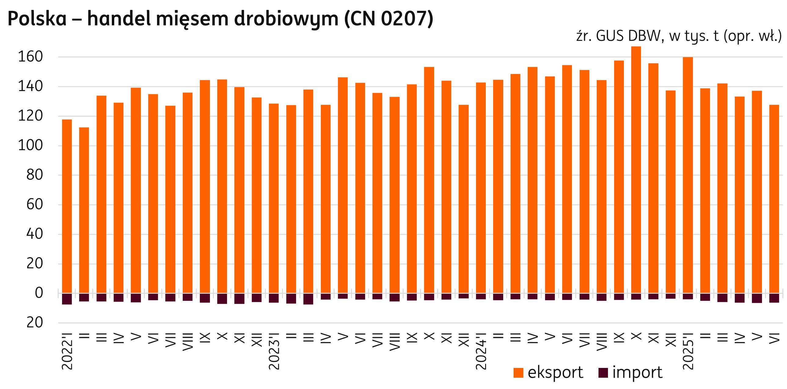 Handel. W pierwszej połowie 2025 r. eksport mięsa drobiowego w wadze produktu (CN 0207) spadł o 6% w porównaniu rocznym, przy wolumenie osiągającym 839 tys. t (-52 tys. t r/r, dane GUS Dziedzinowe Bazy Wiedzy). W czerwcu eksport był niższy w ujęciu rocznym o 17%, osiągając 128 tys. t (-27 tys. t r/r). Import tego rodzaju produktów w okresie I-VI 2025 r. osiągnął 34 tys. t, rosnąc o 32% w relacji do analogicznego okresu ubiegłego roku (+8 tys. t r/r).