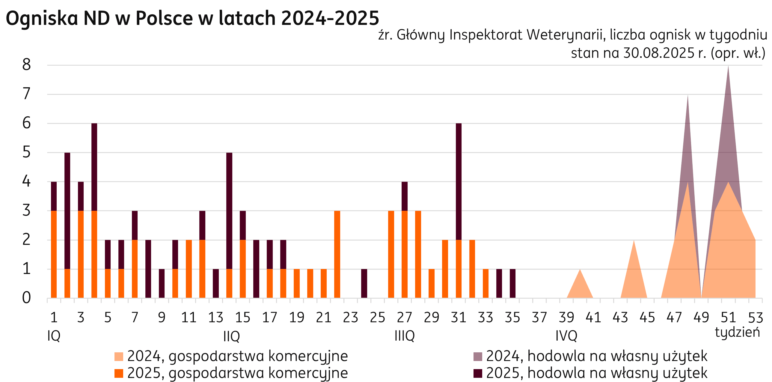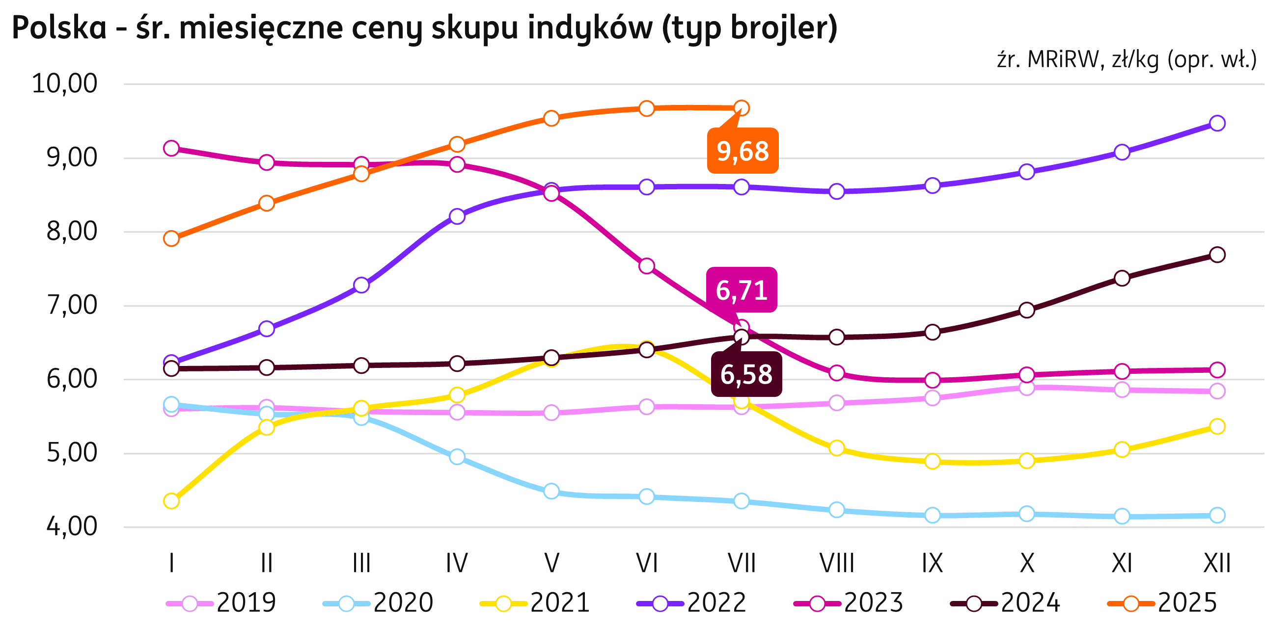 Polska jest największym producentem i eksporterem drobiu w Unii Europejskiej, a także trzecim co do wielkości eksporterem mięsa kurzego na świecie, wyprzedzają nas tylko Stany Zjednoczone i Brazylia. Ubiegły rok był znakomity dla producentów brojlerów kurzych, ale wskutek zwiększonej liczny przypadków grypy ptaków (HPAI) oraz rzekomego pomoru drobiu (ND) od października ubiegłego roku do maja br. (przypadki ND stwierdzane są do sierpnia), odnotowano obniżenie skupu drobiu. Produkcja kurczaków w pierwszej połowie 2025 spadła 4%, a indyka o 6% w ujęciu rocznym (dane Agridata). Dużą rolę w odbudowie produkcji gra długość cyklu produkcyjnego, która dla brojlerów kurzych wynosi 6-7 tygodni, a dla indyków koło 4-5 miesięcy. Również w przypadku handlu, jego poziom obniżył się w ujęciu rocznym, w pierwszej połowie 2025 roku o 5% w przypadku kurczaków i o 9% dla indyków (dane GUS). Niższa podaż wpłynęła na wzrost cen drobiu, brojler kurzy osiągnął rekord w czerwcu i w kolejnych miesiącach widzimy już spadek cen. Cena indyka dłużej utrzymywała się w trendzie wzrostowym, ale w sierpniu też już cena zaczęła powoli spadać. Ceny paszy, które w tym czasie pozostawały na relatywnie stabilnym poziomie (dane MRiRW) przyczyniły się do wzrostu opłacalności produkcji mierzonej relacją cen drobiu do cen paszy (dane MRiRW).