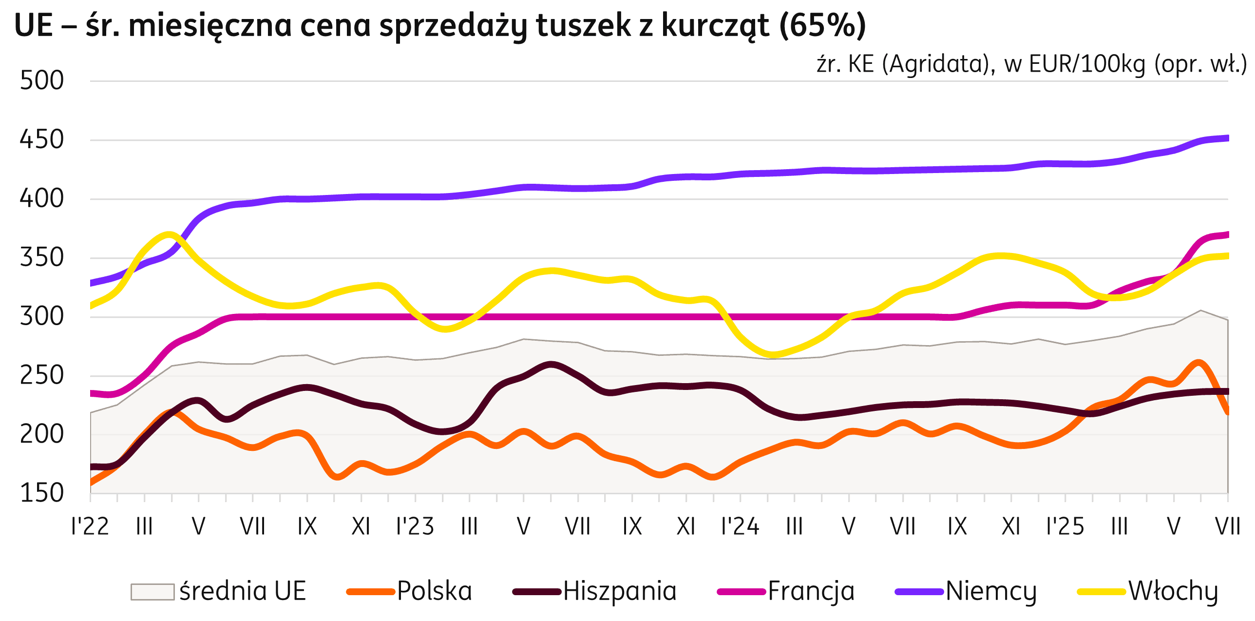 Unia Europejska. Średnia cena tuszki kurczaka (65%) w krajach Unii Europejskiej w lipcu 2025 r. spadła z rekordowego poziomu notowanego w czerwcu o 3% do 297,26 EUR/100kg (-8,45 EUR/100kg m/m). Lipcowe notowania kształtują się o 8% powyżej ubiegłorocznych z tego okresu. W Polsce, zgodnie z danymi KE, cena tego produktu w lipcu kształtowała się na poziome 218,61 EUR/100kg, o 16% poniżej średniej unijnej.