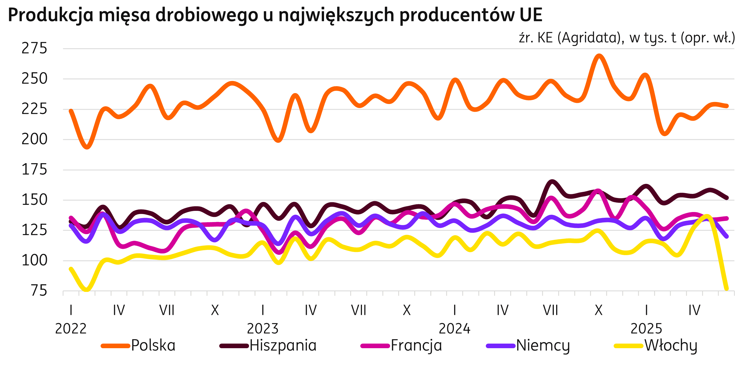 Unia Europejska. W pierwszej połowie 2025 r. produkcja mięsa drobiowego w krajach Unii Europejskiej osiągnęła 6 787 tys. t, o 1% poniżej wyniku z analogicznego okresu ubiegłego roku (-59 tys. t r/r). Produkcja spadła nie tylko w Polsce (-5% r/r), ale także wśród pozostałych istotnych producentów wolumen skupu obniżył się w zestawieniu z 2024 r.: we Francji o 4% r/r, w Niemczech o 2% r/r, we Włoszech o 3% r/r. Wyjątkiem jest Hiszpania, w tym kraju produkcja wzrosła o 7% w relacji rocznej.
