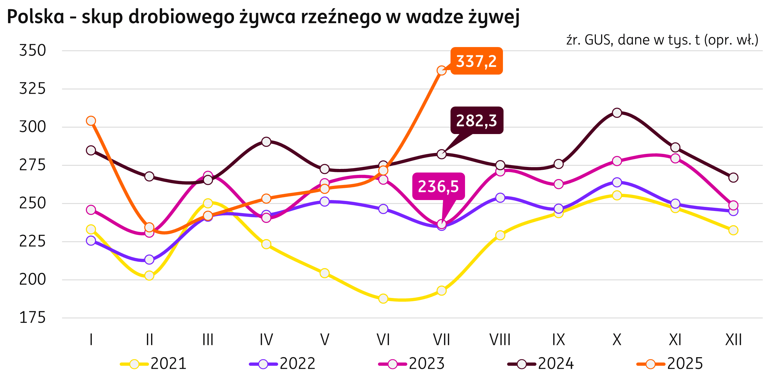 Produkcja. Skup drobiu w Polsce osiągnął w lipcu 2025 r. 337 tys. t, o 55 tys. t więcej niż w lipcu ubiegłego roku (+19% r/r) i o 65 tys. t powyżej skupu z czerwca (+24% m/m). Tak znaczny skup w lipcu może być wynikiem kumulacji cykli produkcyjnych, będącej pochodną zwiększonej zachorowalności drobiu na HPAI i ND ostatniej zimy i wiosny. Po upływie siedmiu miesięcy 2025 r. skup osiągnął 1 902 tys. t, o 2% poniżej poziomu notowanego w ubiegłym roku (-36 tys. t r/r).