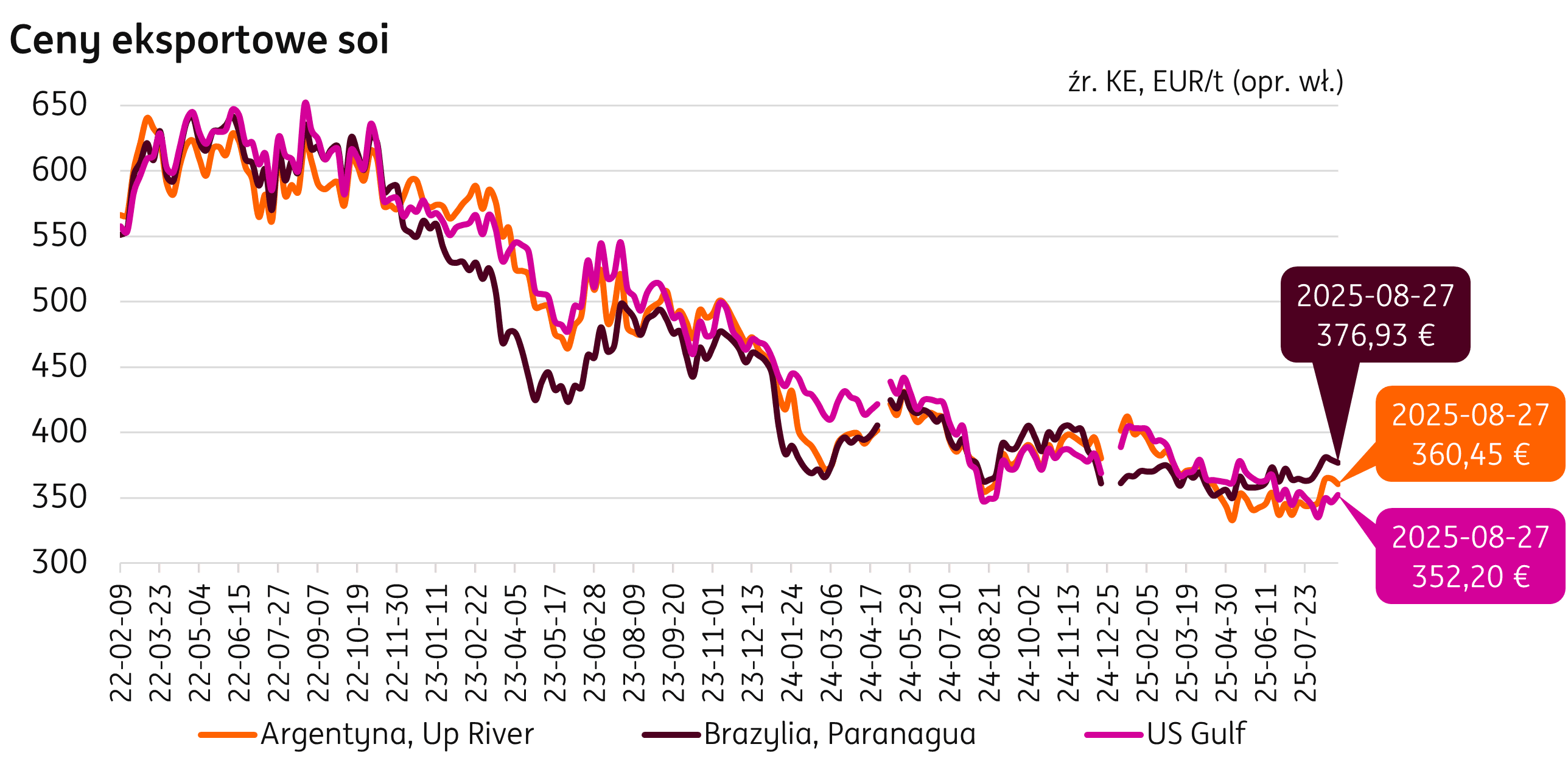 Ceny soi i śruty sojowej. Pod koniec sierpnia 2025 r. odnotowano wzrost cen soi w ujęciu miesięcznym w trzech analizowanych portach. Najbardziej cena wzrosła w Argentynie (Up River), średnie notowania podniosły się o 5% m/m, do 360 EUR/t (-0,3% r/r, dane zgodnie z raportami KE). Cena w Brazylii (Paranagua) wzrosła o 3% w ciągu miesiąca, do poziomu 377 EUR/t (+3% r/r), natomiast USA (Gulf) do 27 sierpnia 2025 r. cena osiągnęła 252 EUR/t (+2% m/m; +0,4% r/r).