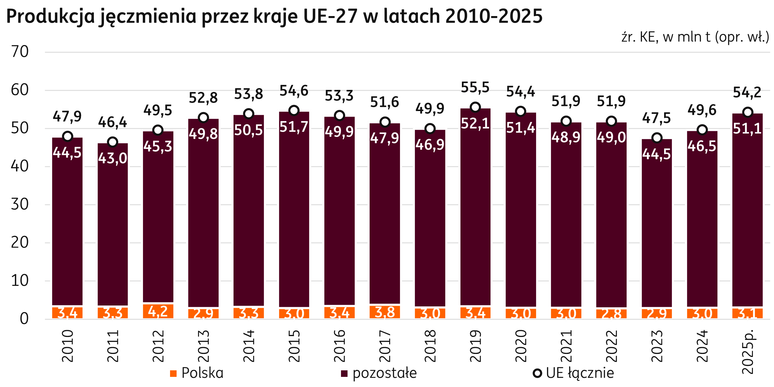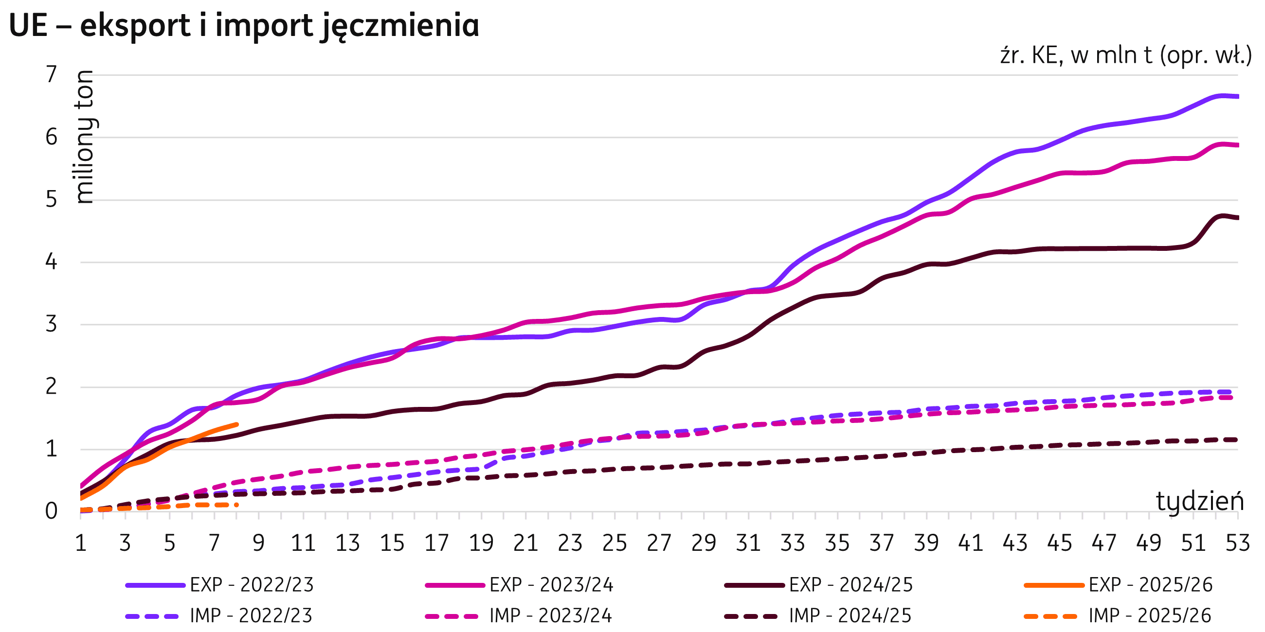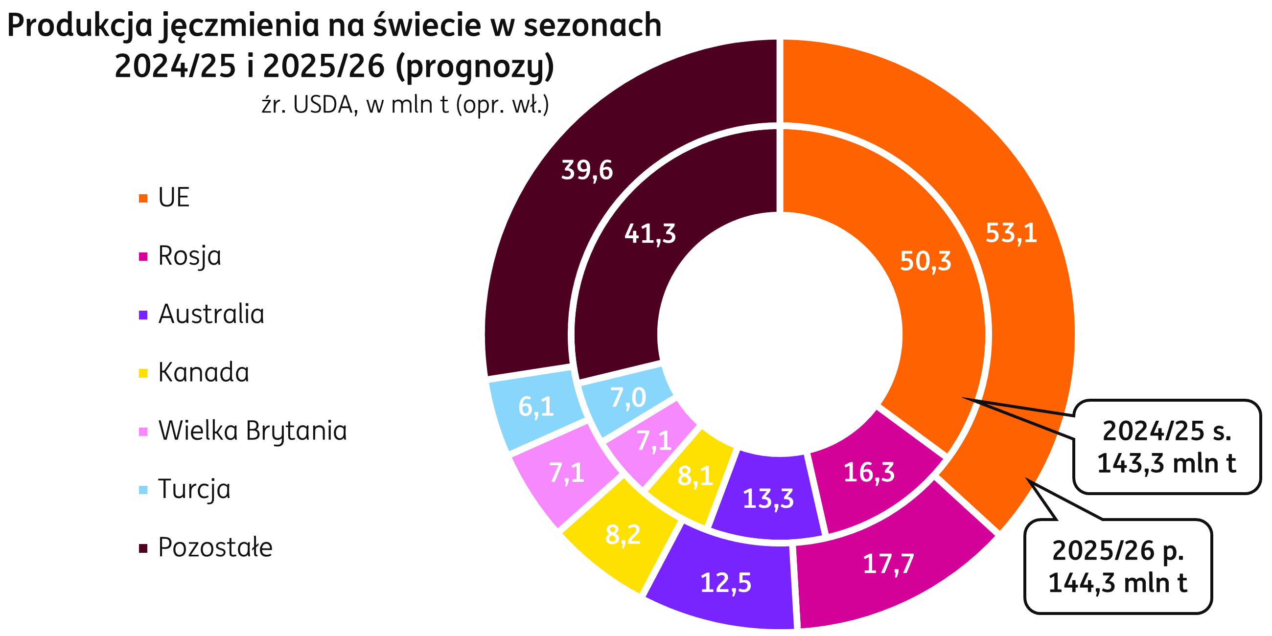 Unia Europejska. W sezonie 2025/26, zgodnie z bilansem publikowanym przez KE, zużycie jęczmienia w krajach UE wyniesie 42,8 mln t, 0,3 mln t powyżej konsumpcji z sezonu 2024/25. Poziom eksportu ma wzrosnąć do 10,1 mln t (+1,4 mln t r/r), a zapasy końcowe są przewidywane na poziomie 5,2 mln t (+2,3 mln t r/r) przy podwyższonym do 1,5 mln t (+0,2 mln t r/r) imporcie.