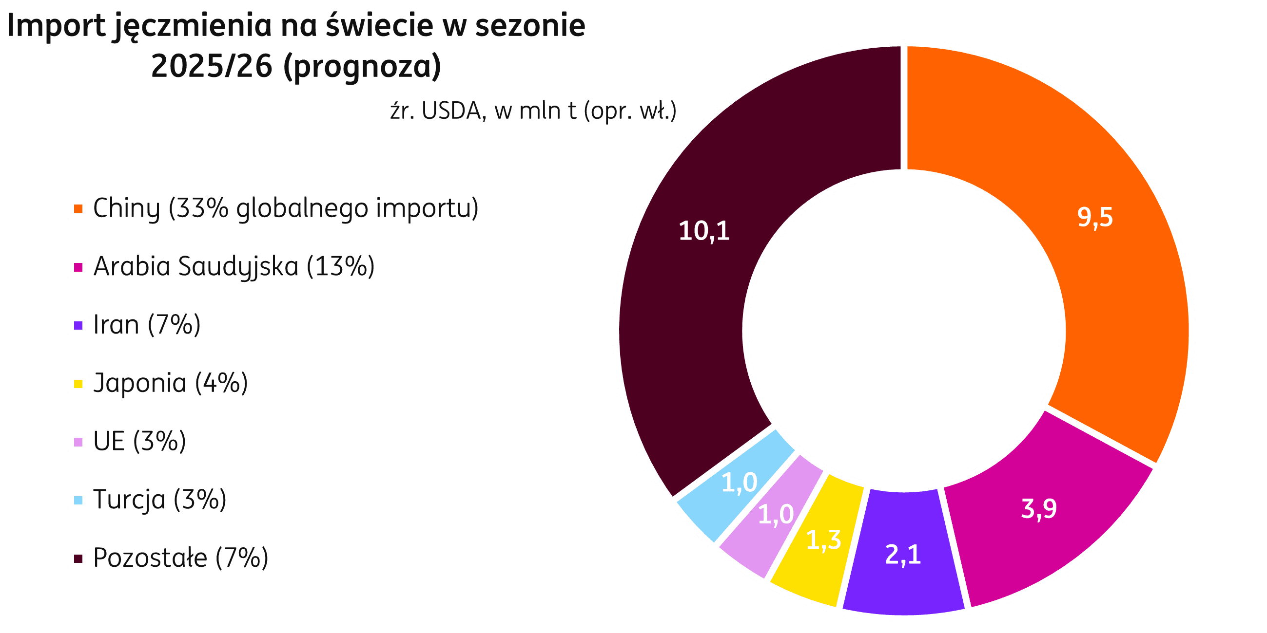 Liderem wśród importerów pozostają Chiny, dostawy do tego kraju mają osiągnąć 9,5 mln t, porównywalnie do ubiegłego roku. Na kolejnych pozycjach są Arabia Saudyjska: 3,9 mln t (+0,4 mln t r/r) i Iran: 2,1 mln t (-0,2 mln t r/r).