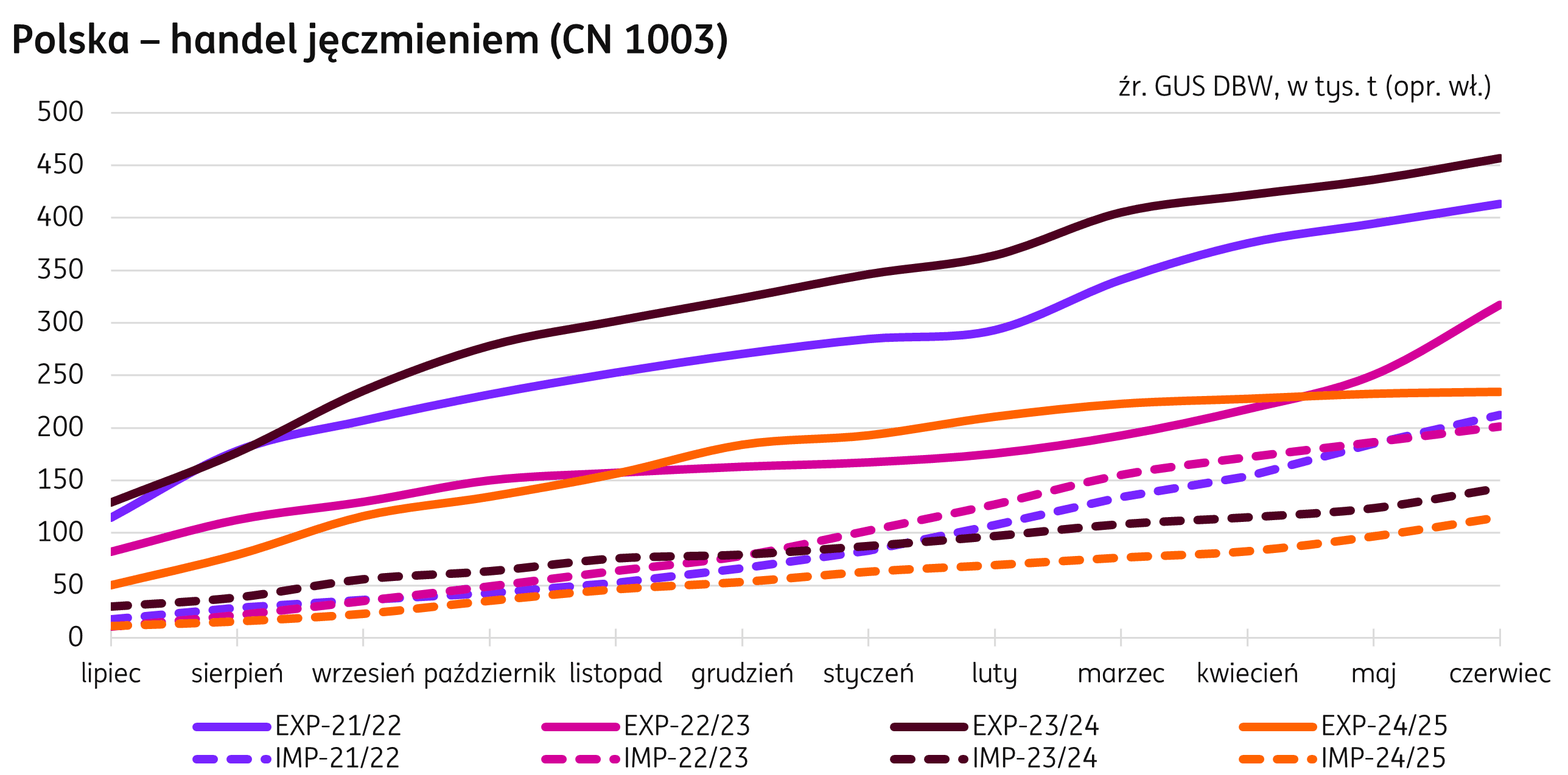 Handel. Sezon 2024/25 zakończył się eksportem jęczmienia z Polski o wolumenie 234 tys. t, o 49% poniżej poziomu ubiegłorocznego. W czerwcu eksport jęczmienia był o 91% niższy niż w ubiegłym roku przy wolumenie ledwie 2 tys. t. Import również utrzymał się na poziomie niższym od ubiegłorocznego z wolumenem 115 tys. t (-19% r/r), a w samym czerwcu osiągnął 18 tys. t, o 4% mniej niż przed rokiem.