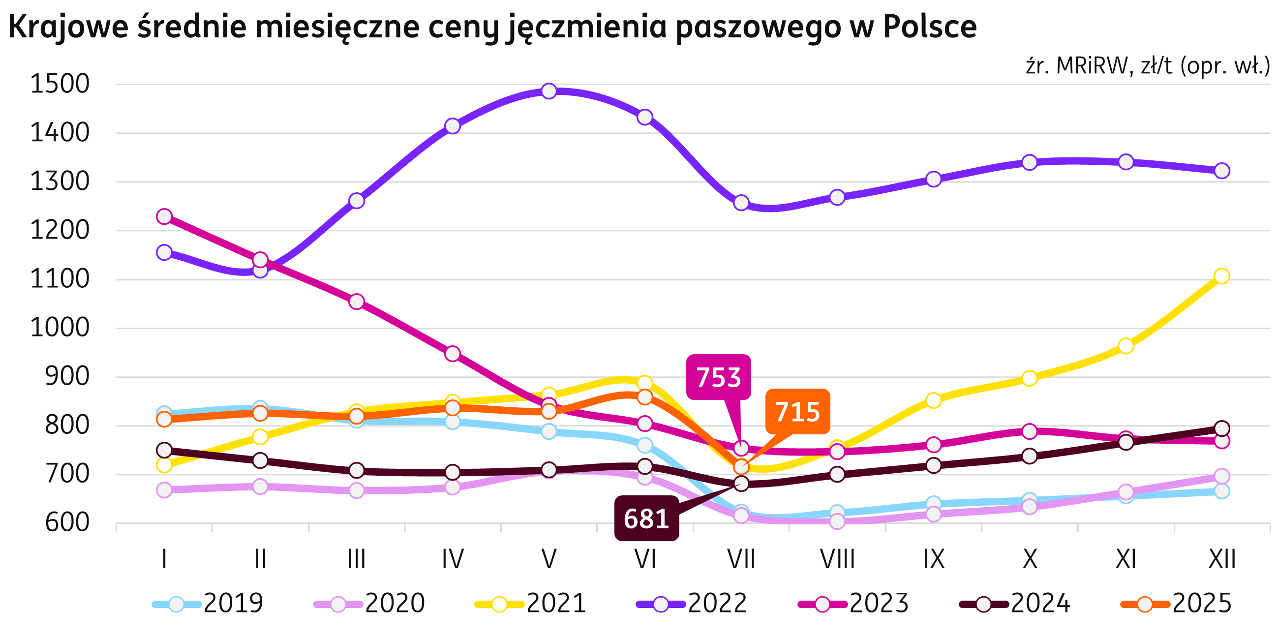 Ceny. Lipcowa średnia cena jęczmienia paszowego w Polsce, według Biuletynu MRIRW, zanotowała miesięczny spadek w wysokości 17% m/m, obniżając się do 715 zł/t, to jednak wciąż 5% więcej niż przed rokiem. Na rynku krajowym w tygodniu kończącym się 31 sierpnia 2025 r. średnie ceny jęczmienia paszowego kształtowały się w przedziale 609-757 zł/t.