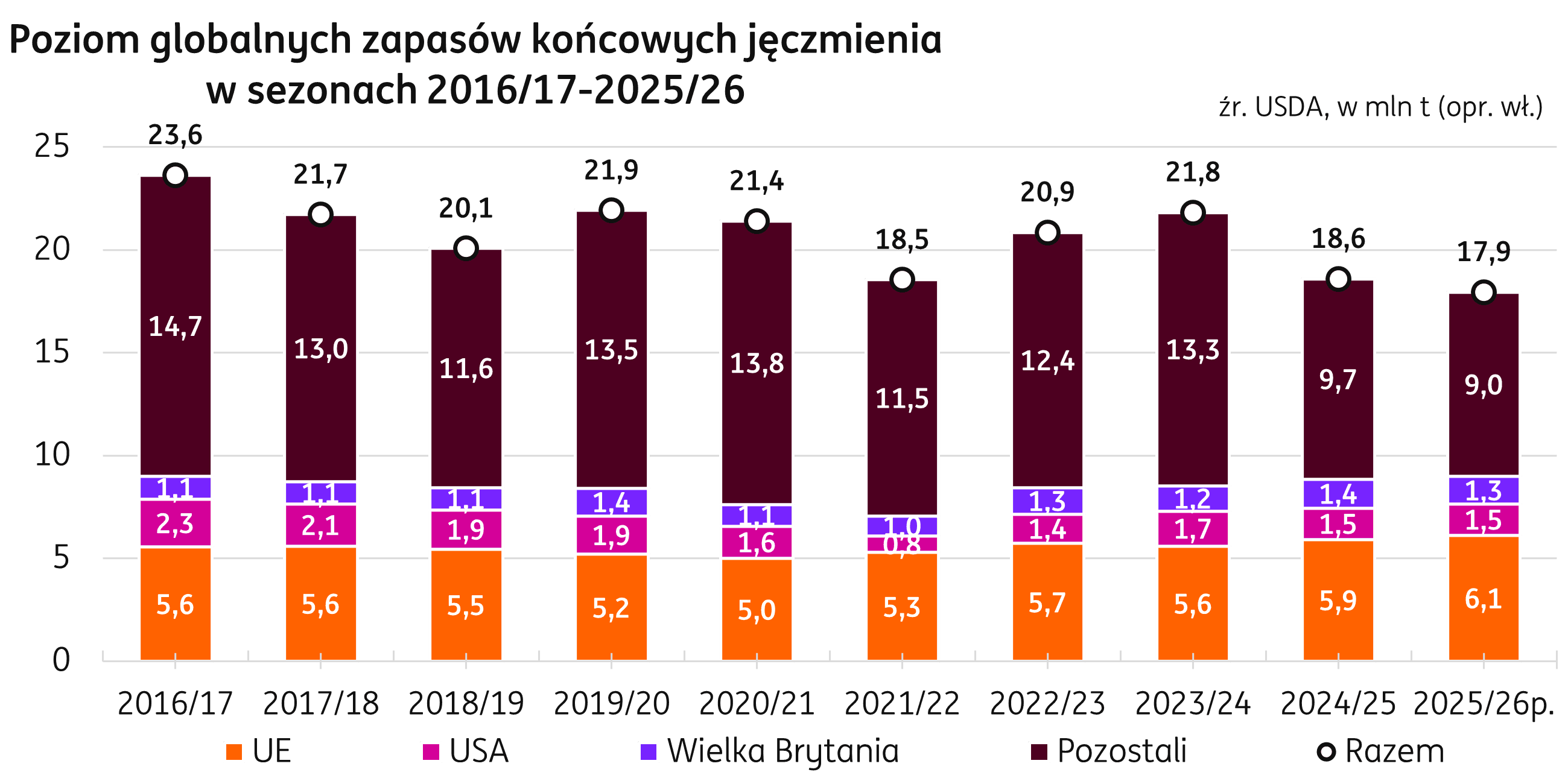 Świat. W sierpniowych prognozach USDA zapasy jęczmienia kończące sezon 2025/26 są prognozowane na poziomie 18,0 mln t, o 0,6 mln t niżej niż w poprzednim sezonie. Kraje Unii Europejskiej mają na koniec sezonu zgromadzić 6,1 mln t jęczmienia, co stanowi 34% światowych zapasów. Kolejne są Stany Zjednoczone z wolumenem 1,5 mln t, posiadające 8% udziału oraz Wielka Brytania z zapasami 1,3 mln t i siedmioprocentowym udziałem w globalnych zapasach końcowych.