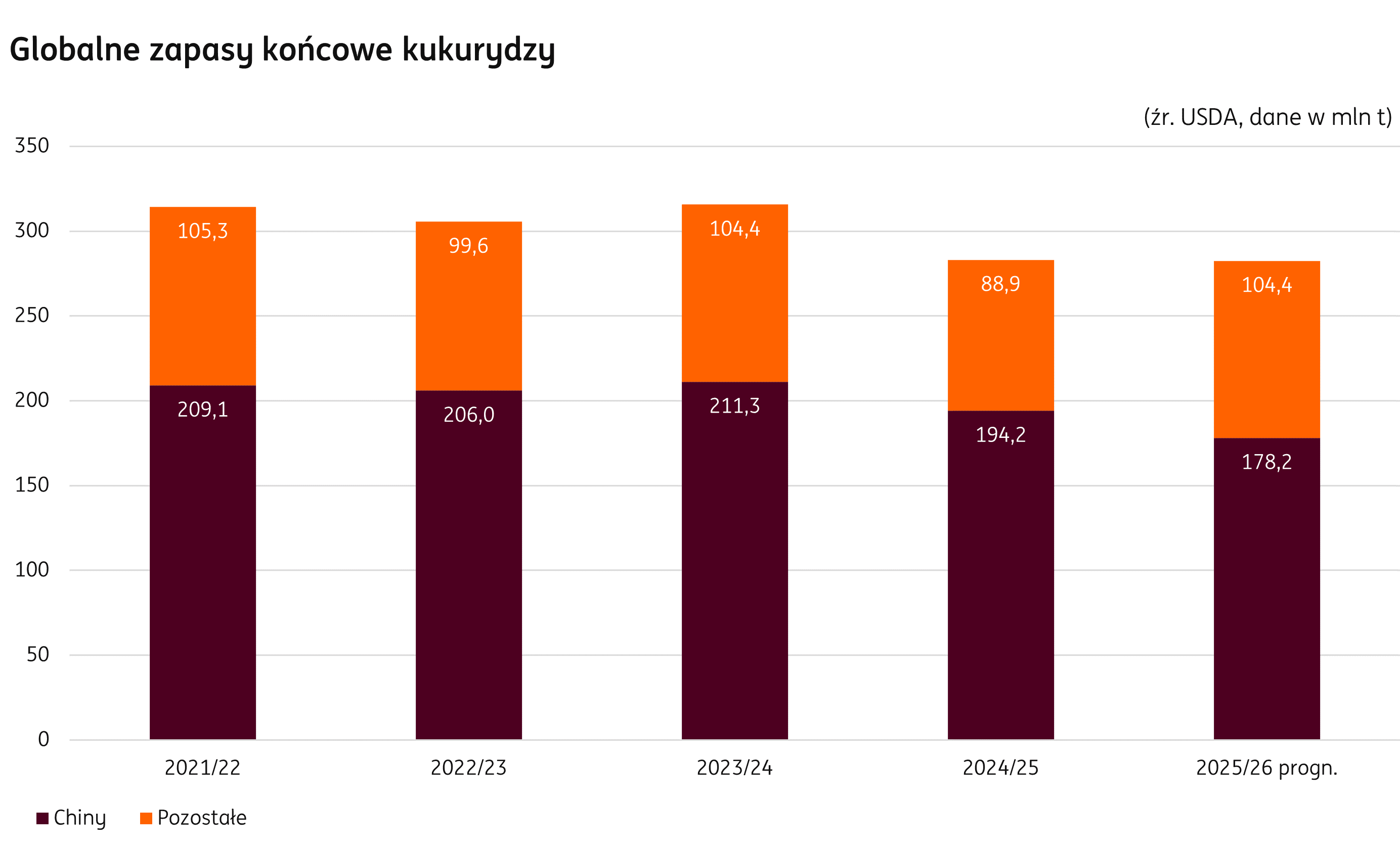 Rośnie prognoza dotycząca zapasów końcowych. Po dużej korekcie, ich poziom wraca do pułapu z sezonu 2024/25. W stosunku do danych lipcowych wzrósł o blisko 4% przekraczając 282 mln t. Wolumen jest minimalnie niższy r/r.