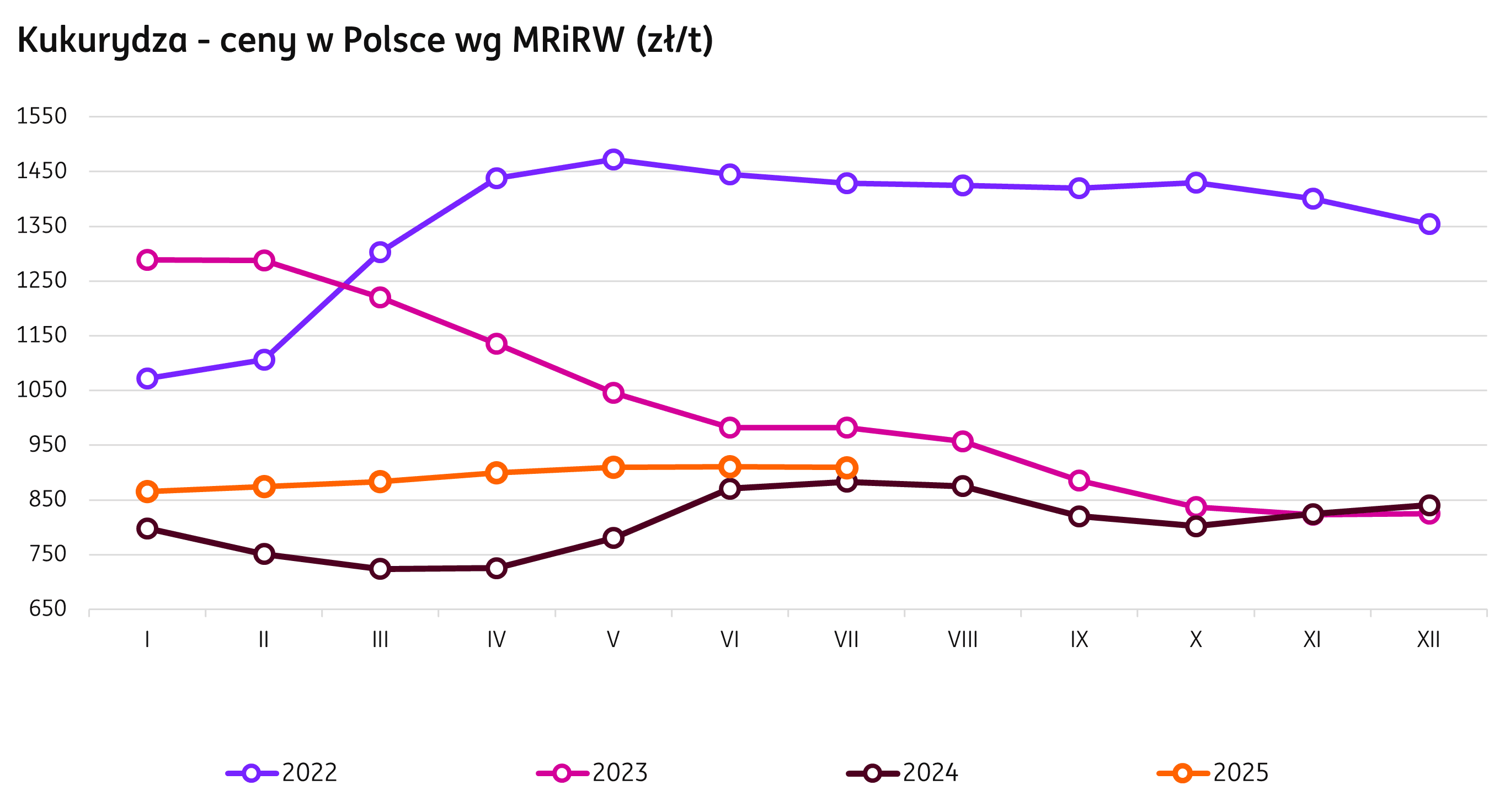 Zgodnie z systemem informacji MRiRW kukurydza paszowa w lipcu 2025 r. odnotowała minimalną obniżkę. Wartość 909 zł/t w ujęciu miesięcznym była o 2 zł niższa. W porównaniu z lipcem 2024 r. stawka jest wyższa o 26 zł (+3%).