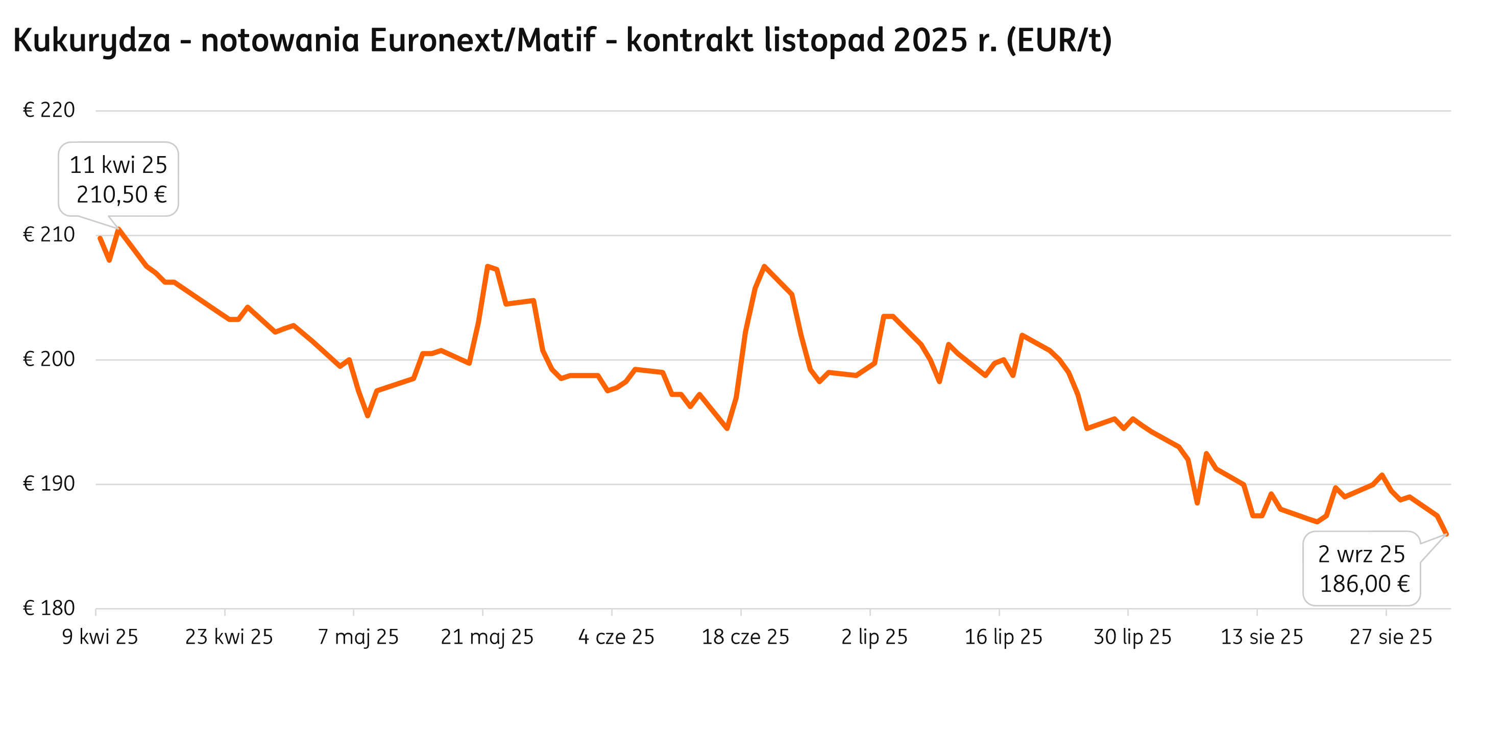 Kukurydza na Euronext/Matif rozpoczeła lipiec od wzrostów, kontynuując trand utrzymijacy się od połowy czerwca. Stawki umacniały się do drugiej połowy miesiąca przekraczjąc 210 EUR. Wraz ze bliżaniem się kontaktu do terminu zapadalnośći (sierpień 2025 r.) w ostatnich dniach lipca doszło do znaczącej korekty spadkowej (do niemal 195 EUR).