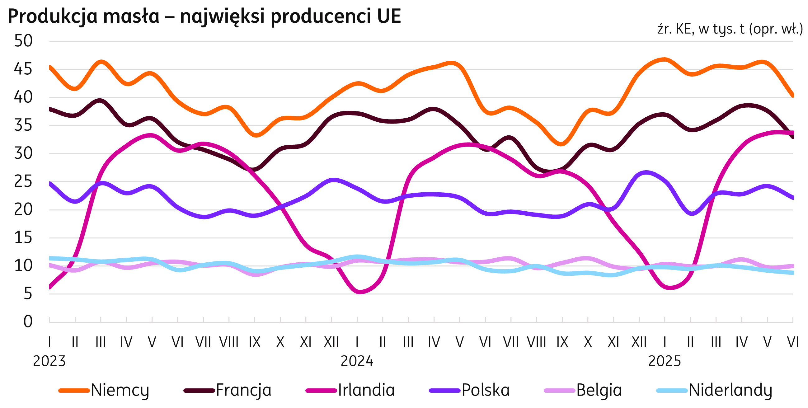 Po upływie połowy 2025 r. produkcja masła utrzymuje się na poziomie wyższym od ubiegłorocznej o 26,3 tys. t, osiągając wolumen 1 122 tys. t (+2,4% r/r, dane zgodnie z raportem KE. Za wzrost produkcji odpowiedzialne są głównie Niemcy, zwiększające produkcje o 12,0 tys. t r/r w tym okresie (+5% r/r), istotnie produkcję zwiększono również w Irlandii (+6,2 tys. t, +5% r/r). Pozwala to skompensować z nadwyżką spadki produkcji w takich krajach, jak Holandia (-7,1 tys. t, -11% r/r), czy Belgia (-4,2 tys. t, -6% r/r). Polska produkcja kształtowała się w tym okresie o 4,5 tys. t powyżej poziomu ubiegłorocznego (+3% r/r).