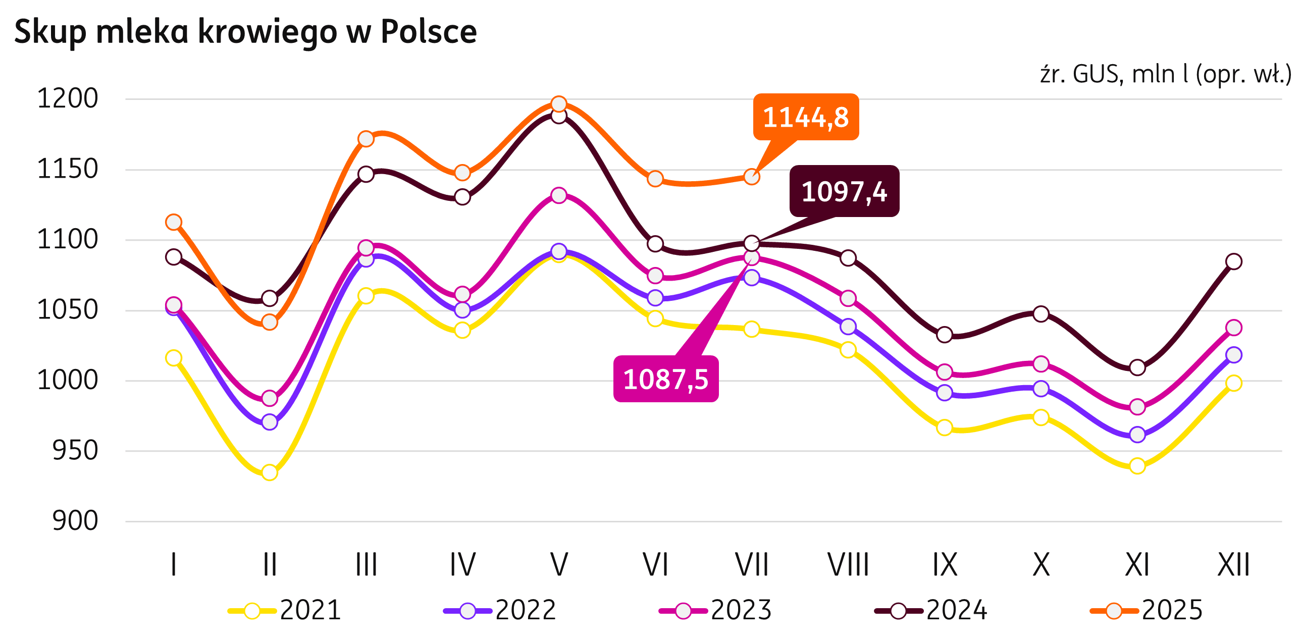 Produkcja mleka. Skup mleka w Polsce utrzymał w lipcu 2025 r. wzrost notowany w ubiegłym miesiącu i na poziomie 1144,8 jest o 4,3% wyższy niż w ubiegłym roku (+47,4 mln l r/r, dane Biuletynu Statystycznego GUS). Narastająco skup mleka w okresie I-VII 2025 r. wyniósł 7 958 mln l, o 1,9% powyżej produkcji ubiegłorocznej (+152 mln l r/r).