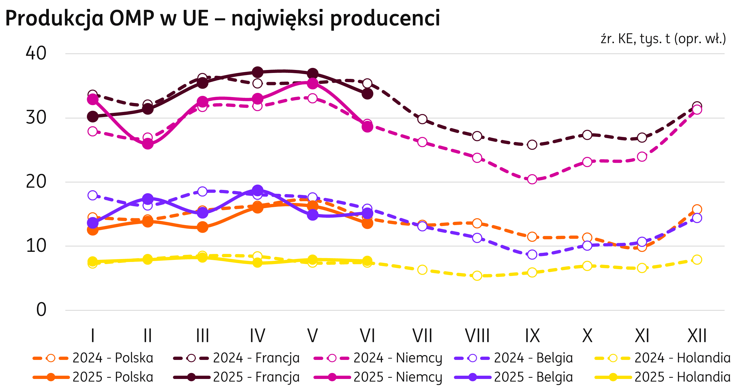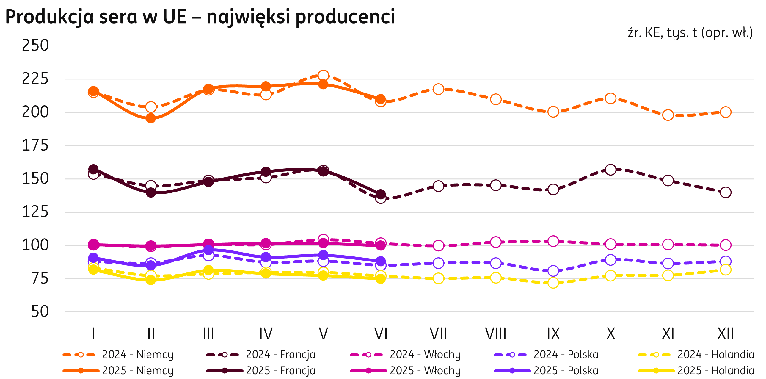 Produkcja sera przez raportujące kraje Unii Europejskiej wzrosła w pierwszej połowie 2025 r. do 4,9 mln t (dane KE), o 0,7% powyżej poziomu ubiegłorocznego (+35,4 tys. t r/r). Wolumenowo, największy wzrost produkcji zanotowano w Polsce, o 16,7 tys. t r/r, kolejne są Hiszpania (+7,8 tys. t r/r) oraz Francja (+3,8 tys. t r/r). Kompensuje to produkcję obniżoną w krajach, jak Niemcy (-8,2 tys. t r/r), czy w Holandia (-7,0 tys. t r/r).