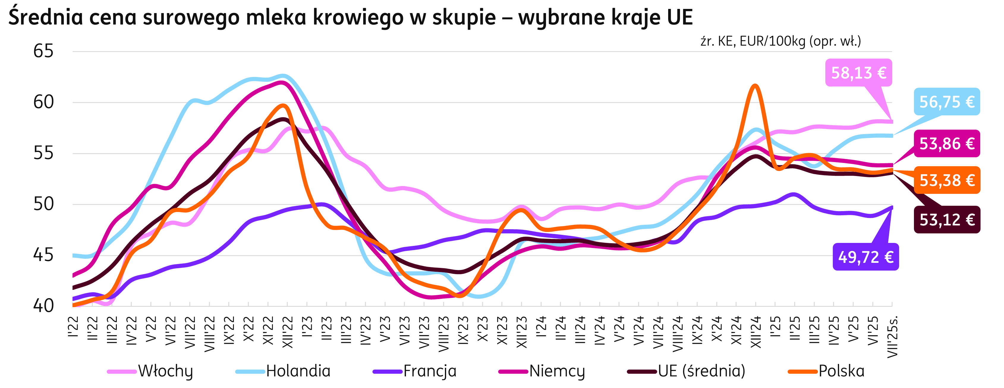 Ceny. Wzrost cen mleka notowano również w lipcu, zgodnie z raportami KE średnia w unijnych skupach to 53,12 EUR/100kg (+0,5% m/m). W porównaniu rocznym, cena ta jest o 14% wyższa. Raportowana cena w Polsce, zgodnie z unijnymi danymi, to 53,38 EUR/kg, o 0,5% powyżej średniej unijnej.