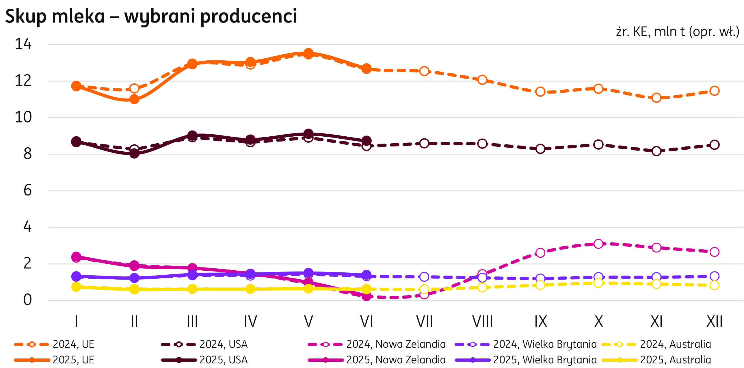 Produkcja mleka. W pierwszej połowie 2025 r. skup mleka w krajach Unii Europejskiej spadł do 12,7 mln t, o 0,6% poniżej poziomu notowanego w analogicznym okresie ubiegłego roku (-0,4 mln t r/r). Największy wolumenowo spadek zaliczyły Niemcy, produkcja w tym kraju obniżyła się od początku roku o 0,4 mln t (-3% r/r). Sporo spadała również produkcja w Holandii (-0,1 mln t; -2% r/r) oraz we Francji (-0,1 mln t; -1% r/r). Największy wzrost w analizowanym okresie osiągnęła Irlandia, o 0,3 mln t (+7% r/r), a skup mleka w Polsce powiększył się o 1% (+68 tys. t r/r).