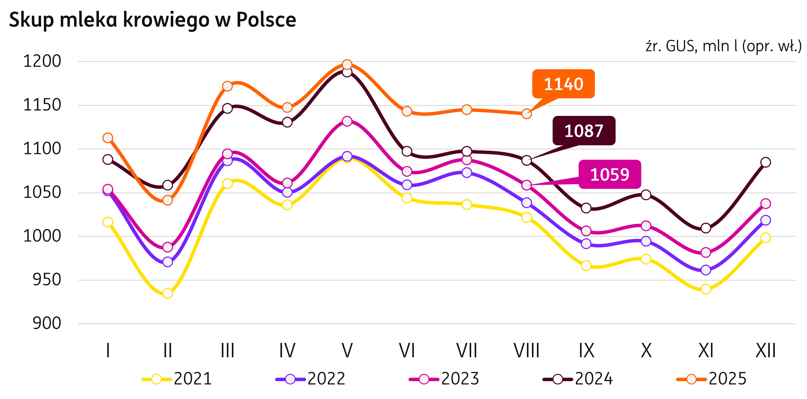 Produkcja mleka. Sierpień to kolejny miesiąc 205 r. ze wzrostem skupu mleka w Polsce przekraczającym 4% w porównaniu do analogicznego miesiąca ubiegłego roku. Skup mleka w tym miesiącu osiągnął 1140 mln l, rosnąc o 53 mln l r/r (+4,9% r/r, dane Biuletynu Statystycznego GUS). Narastająco skup mleka w miesiącach I-VIII 2025 r. wyniósł 9 125 mln l, o 2,2% powyżej produkcji ubiegłorocznej (+196 mln l r/r).
