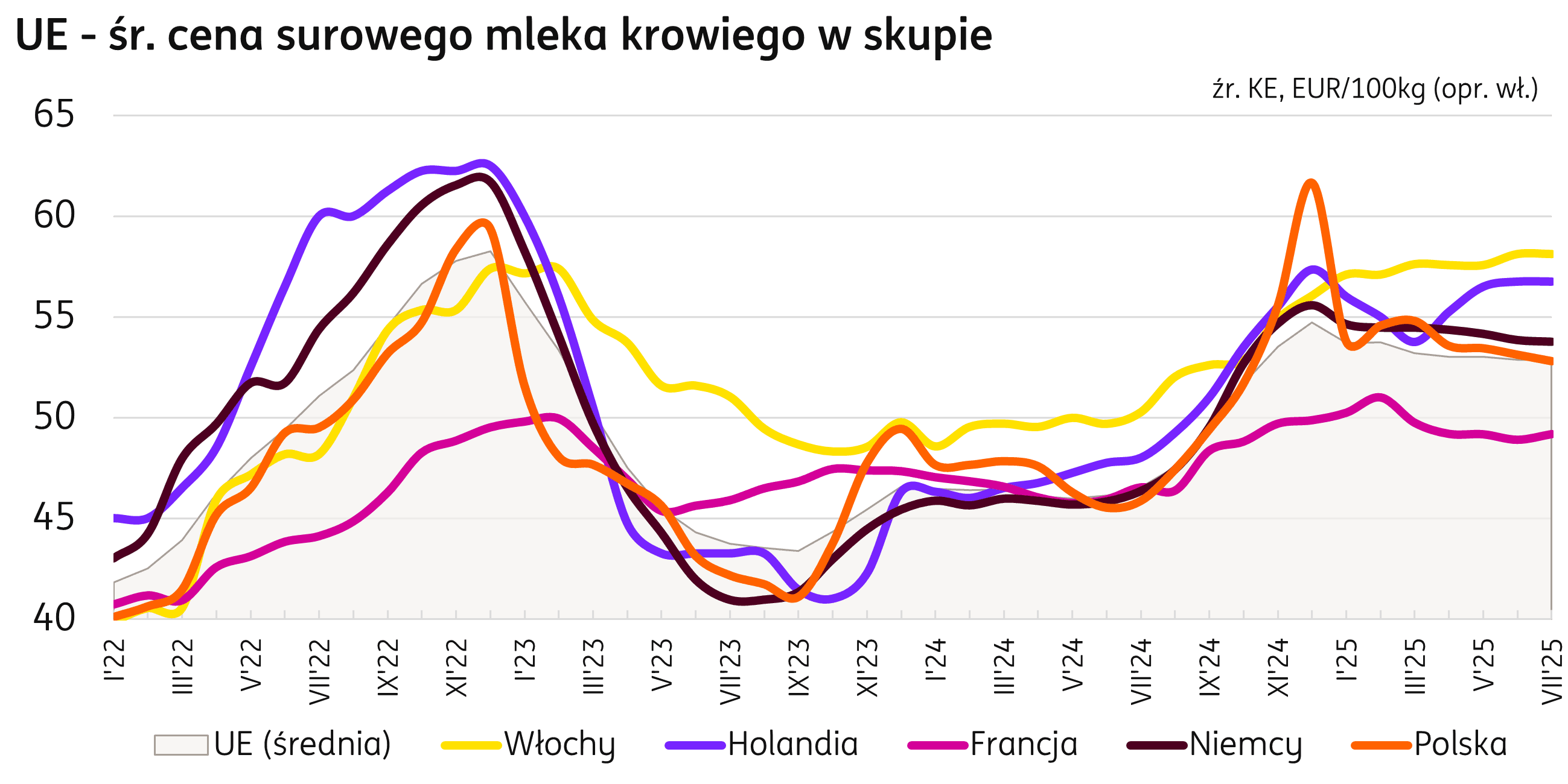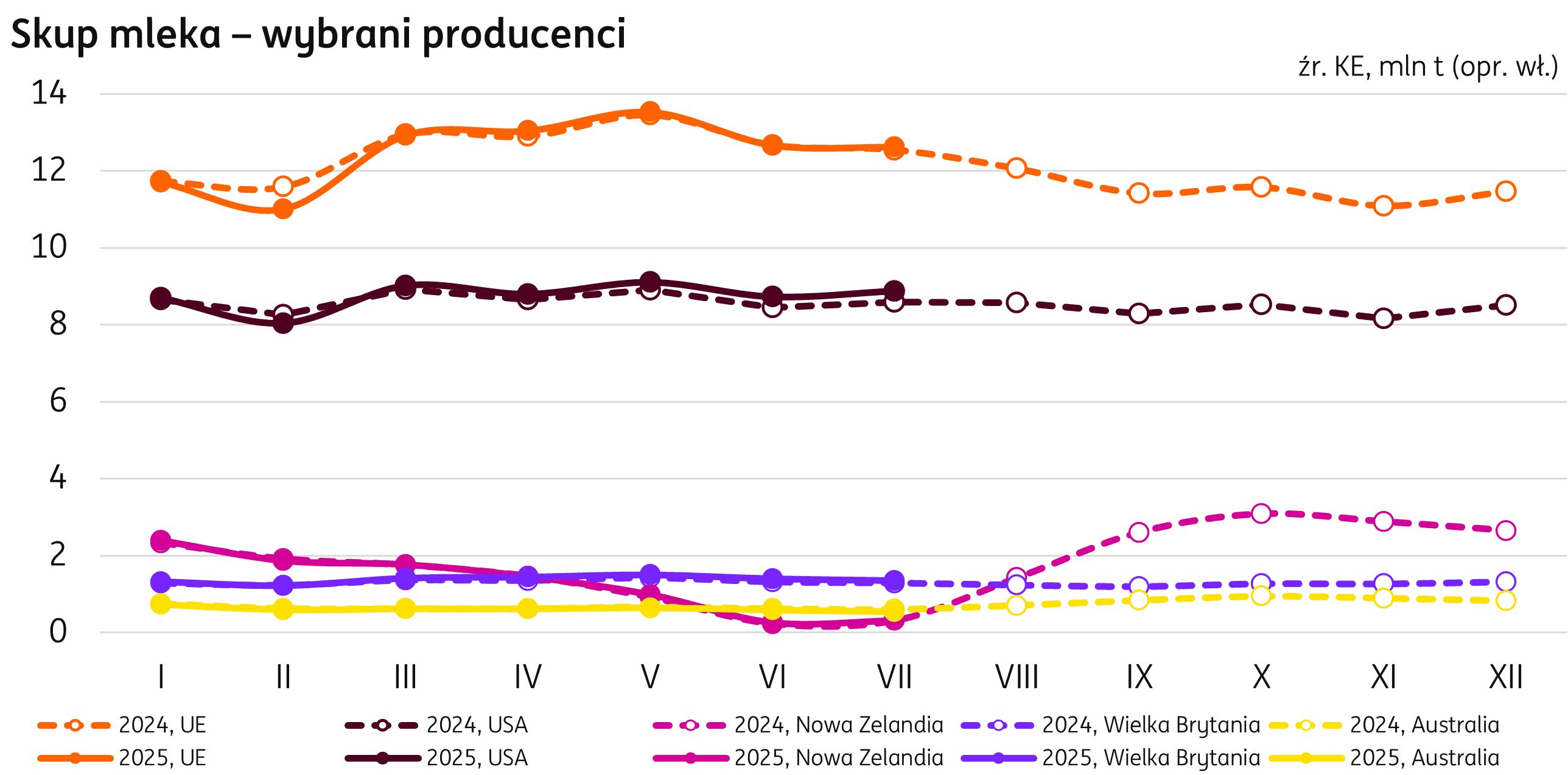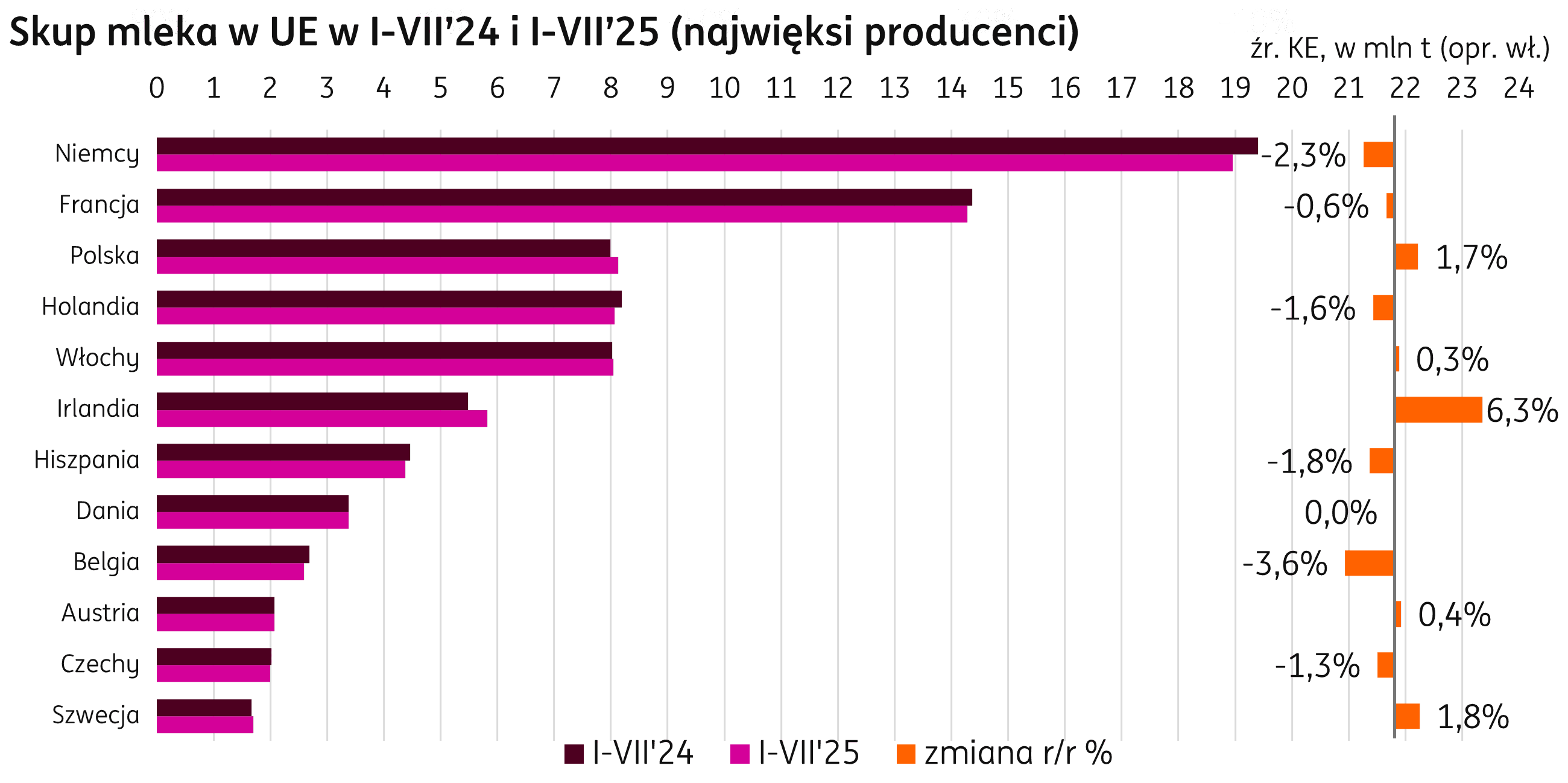 Produkcja mleka. Po siedmiu miesiącach 2025 r. skup mleka w krajach Unii Europejskiej kształtuje się na poziomie 87,5 mln t, o 0,4% poniżej wyniku notowanego w analogicznym okresie ubiegłego roku (-0,4 mln t r/r). Największy wolumenowo spadek utrzymuje się w Niemczech, produkcja w tym kraju obniżyła się o 0,4 mln t (-2% r/r). Spadła również produkcja we Francji (-1% r/r) oraz w Holandii (-2% r/r). Największy wzrost w analizowanym okresie osiągnęła Irlandia, o 0,3 mln t (+6% r/r), a skup mleka w Polsce powiększył się o 2% (+0,1 mln t r/r).