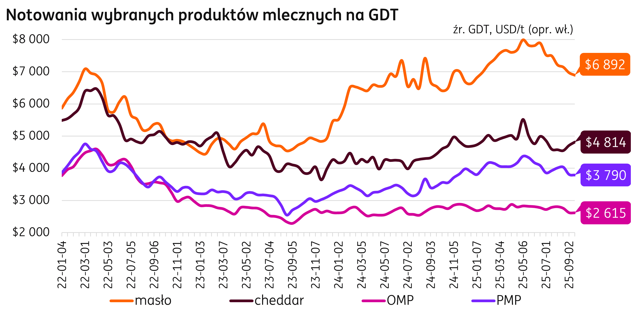 28 września 2025 r. ceny produktów mleczarskich na rynku wewnętrznym UE kształtowały się na następujących poziomach: masło 615 EUR/100 kg (-13% m/m; -20% r/r), OMP 226 EUR/100 kg (-7% m/m; -12% r/r), PMP 389 EUR/100 kg (-6% m/m; -9% r/r), ser cheddar 446 EUR/100 kg (-0,1% m/m; +12% r/r), ser gouda 480 EUR/100 kg (-2% m/m; +5% r/r), serwatka w proszku 98 EUR/100 kg (-1% m/m; +4% r/r).