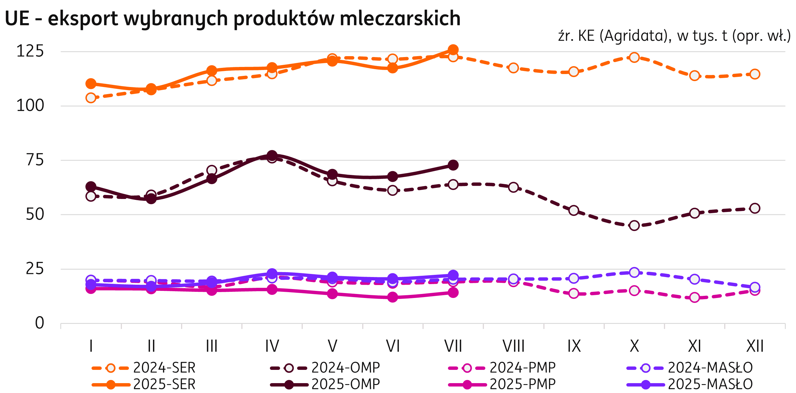 Handel. Według danych raportowanych przez KE (portal Agridata) w okresie I-VIII 2025 r. eksport sera poza grancie UE osiągnął 815 tys. t, o 1,5% powyżej poziomu ubiegłorocznego z analogicznego okresu (+12 tys. t r/r). Dostawy odtłuszczonego mleka w proszku poza UE wzrosły do 473 tys. t, o 4% powyżej wolumenu notowanego w okresie I-VIII 2024 r. (+18 tys. t r/r). Eksport masła narastająco od początku roku kształtuje się nieznacznie powyżej ubiegłorocznego i osiąga 140 tys. t (+0,5% r/r). Spadek jest natomiast pogłębiany w przypadku pełnego mleka w proszku, notując wolumen 103 tys. t (-23% r/r).