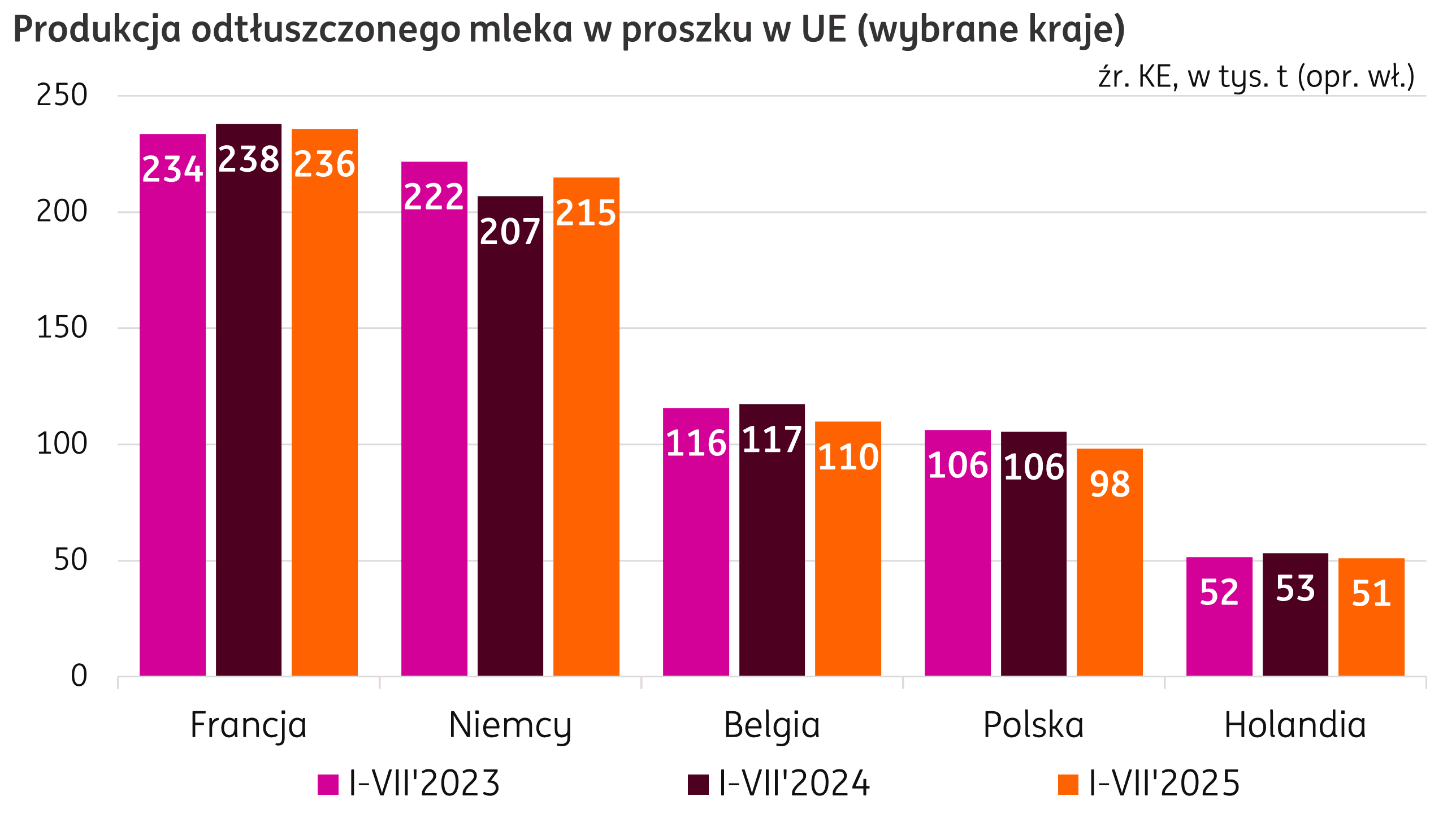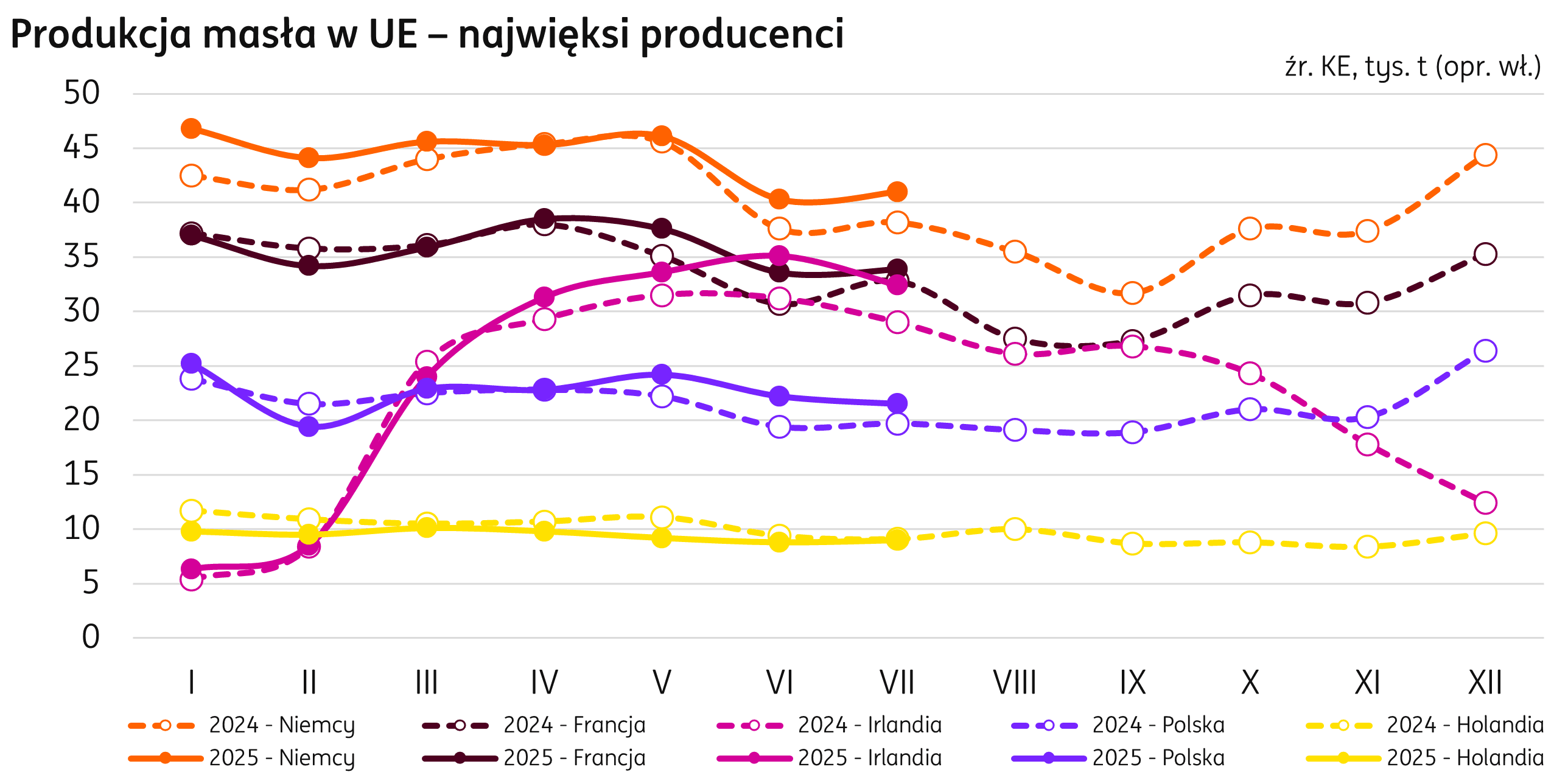 Po upływnie I-VII 2025 r. produkcja masła osiągnęła 1,3 mln t, o 3% przekraczając poziom ubiegłoroczny (raporty KE). Wzrost ten jest notowany szczególnie dzięki zwiększonej o 5% r/r produkcji Niemiec, i o 7% podniesionej produkcji Irlandii. Pozwala to uzupełnić z nadwyżką spadki produkcji w takich krajach, jak Holandia (-10% r/r), czy Belgia (-7% r/r). Polska produkcja kształtowała się w tym okresie o 6,3 tys. t powyżej poziomu ubiegłorocznego (+4% r/r).