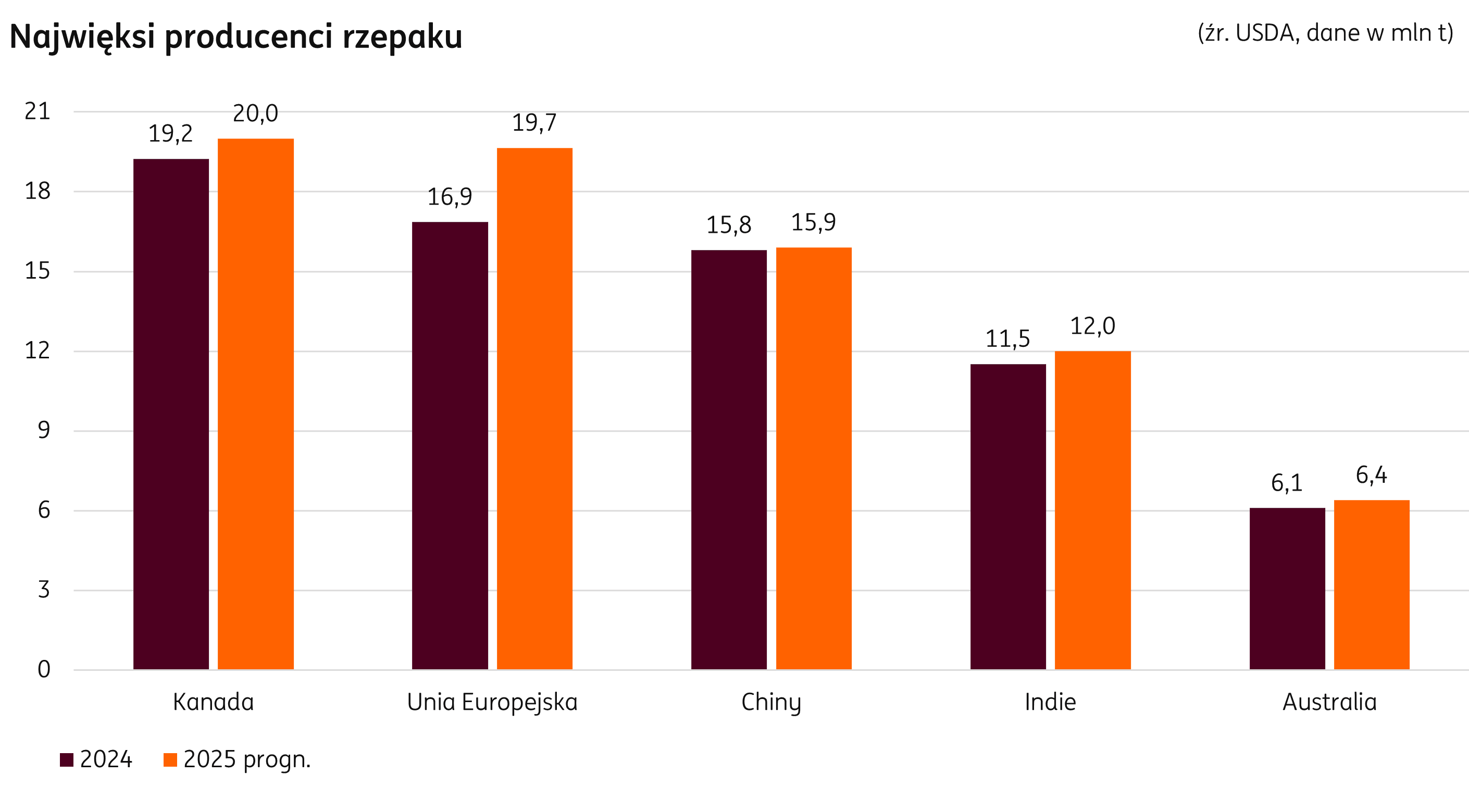 Świat: Wrześniowa aktualizacja Departamentu Rolnictwa USA (USDA) dotycząca sezonu 2025/26 charakteryzowała się niewielkimi wzrostami głównych wartości upraw rzepaku. W porównaniu z wcześniejszymi danymi, nieznacznie zwiększyła się oczekiwana produkcja (aktualizacja w Kanadzie z 19,25 do 20 mln t), jak i areał oraz wydajność. W dalszym ciągu bieżący zbiór rzepaku pozostaje wyższy niż w ubiegłym okresie 2024/25 (zob. tab.). Największy przyrost procentowo i wolumenowo jest w krach Unii Europejskiej (19,65 mln t vs. 16,86 mln t w zeszłym roku, to wzrost o niemal 17%).