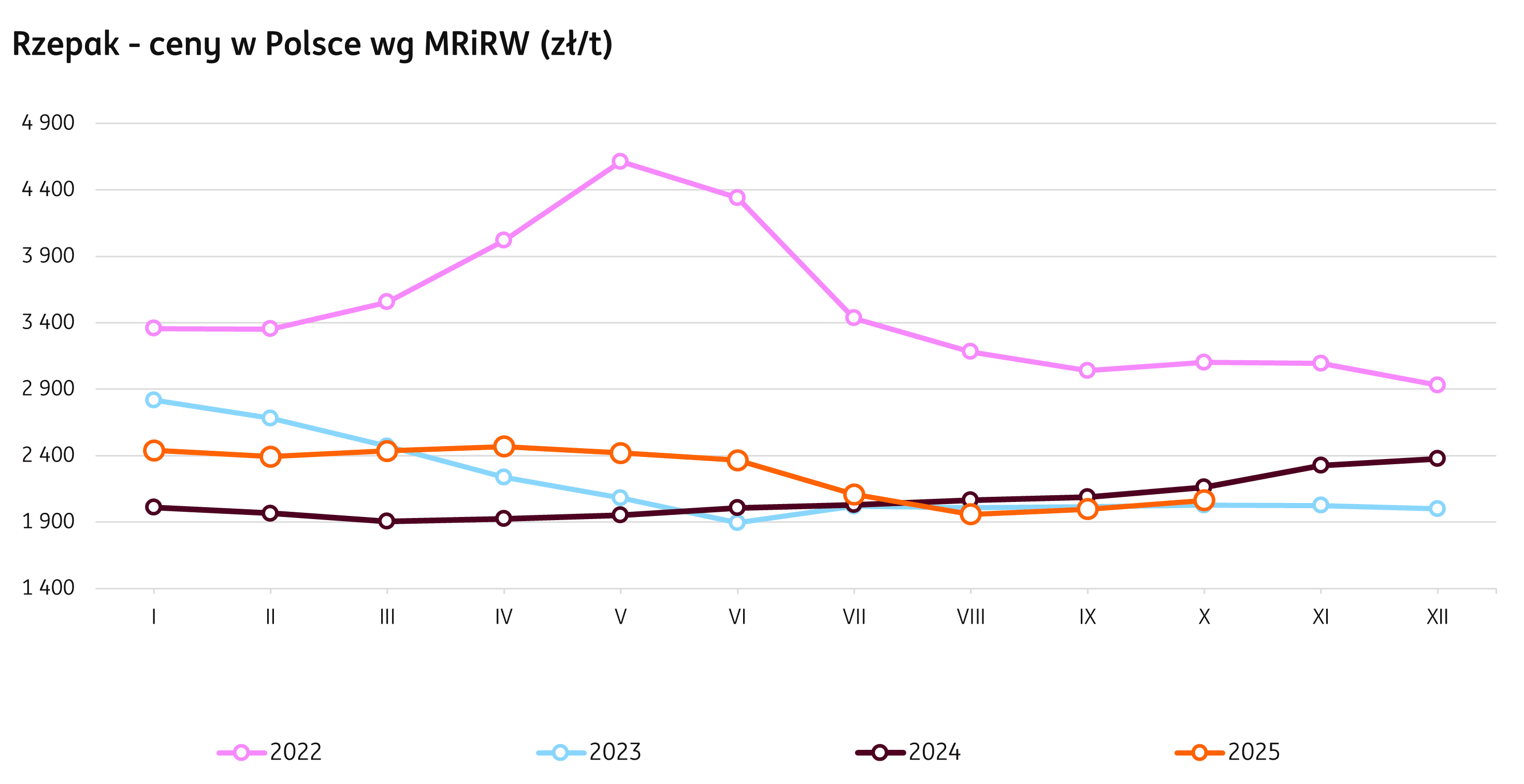 W tygodniu kończącym się 19 października 2025 r. średnie stawki za rzepak wyniosły 2063 zł/t zgodnie z danymi MRiRW. W porównaniu z wcześniejszym tygodniem jest to wzrost o 20 zł (1%). W stosunku do zeszłego roku bieżące ceny są o 4,2% niższe (-90 zł).