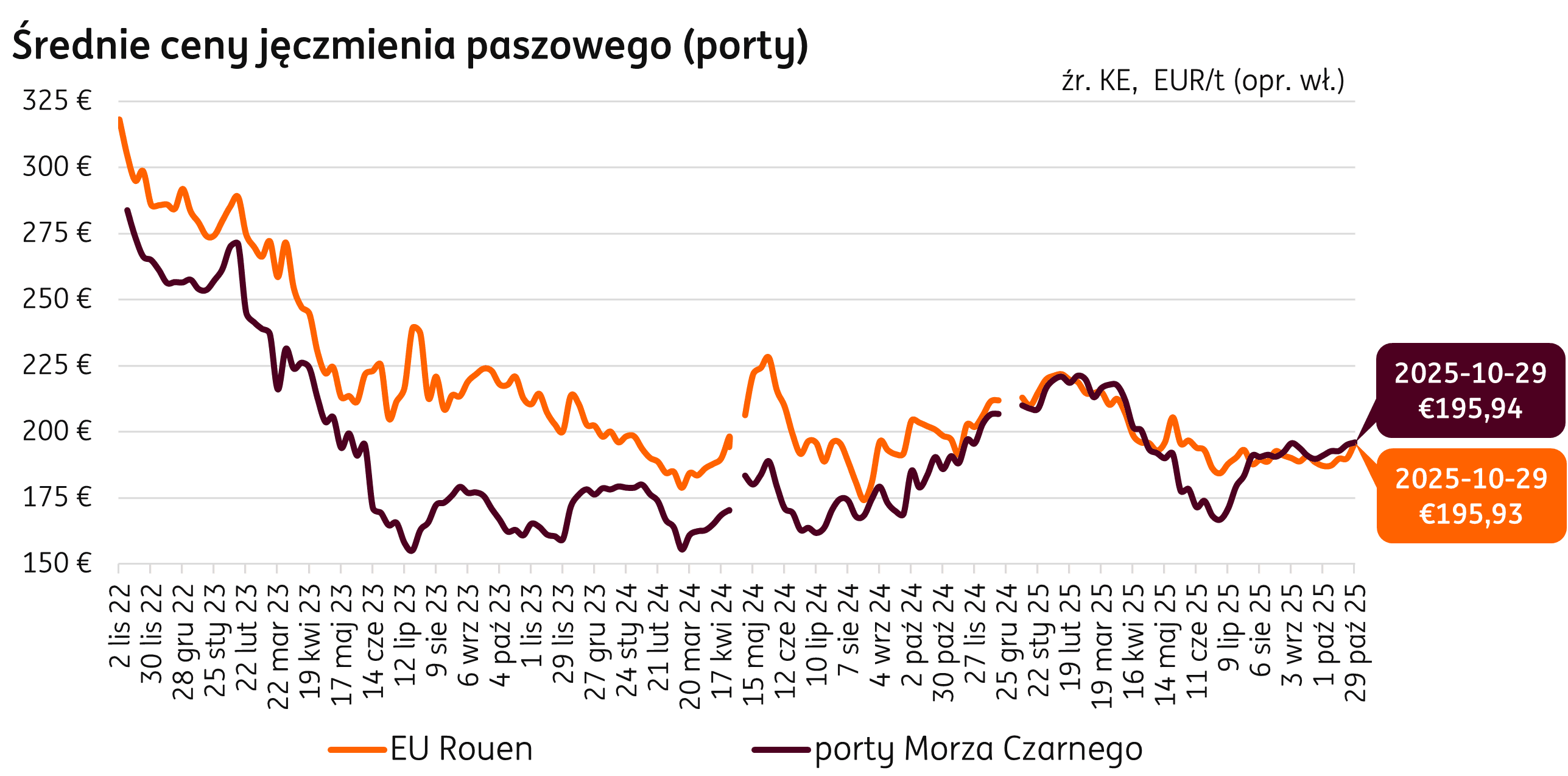 Pod koniec października ceny jęczmienia paszowego podniosły się w obydwu analizowanych portach w relacji miesięcznej. W porcie w Rouen (Francja), zgodnie z danymi publikowanymi przez KE, cena 29 października 2025 r. wzrosła do 196 EUR/t, o 5% powyżej cen z końca września, wciąż są jednak o 1,3% poniżej cen sprzed roku. Ostatni tydzień października przyniósł ze sobą również wzrost cen jęczmienia paszowego w portach Morza Czarnego, średnio kształtowały się one na poziomie 196 EUR/t. To wzrost o 3% w ujęciu miesięcznym i o 5% w relacji rocznej.