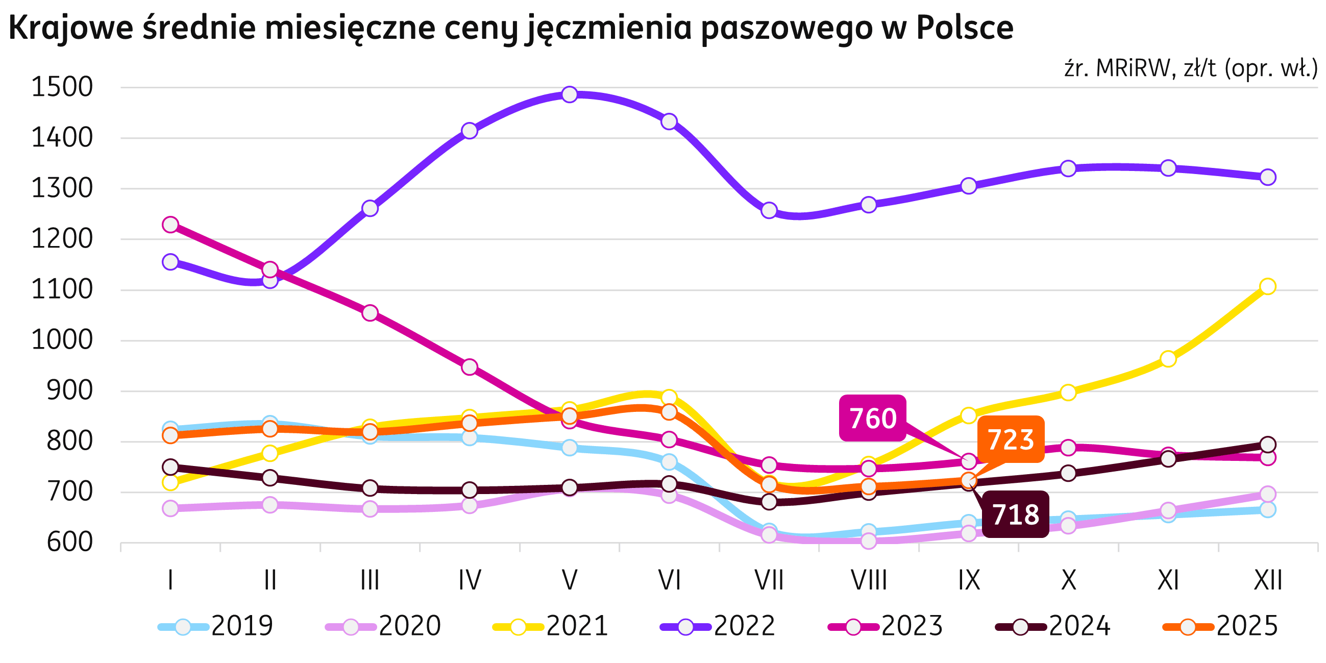 Ceny. Wrześniowa średnia cena jęczmienia paszowego w Polsce, według Biuletynu MRIRW, zanotowała miesięczny wzrost w wysokości 1%, podnosząc się do 723 zł/t, to 1% ponad poziom osiągnięty we wrześniu ubiegłego roku. Na rynku krajowym w tygodniu kończącym się 26 października 2025 r. średnie ceny jęczmienia paszowego kształtowały się w przedziale 648-794 zł/t.