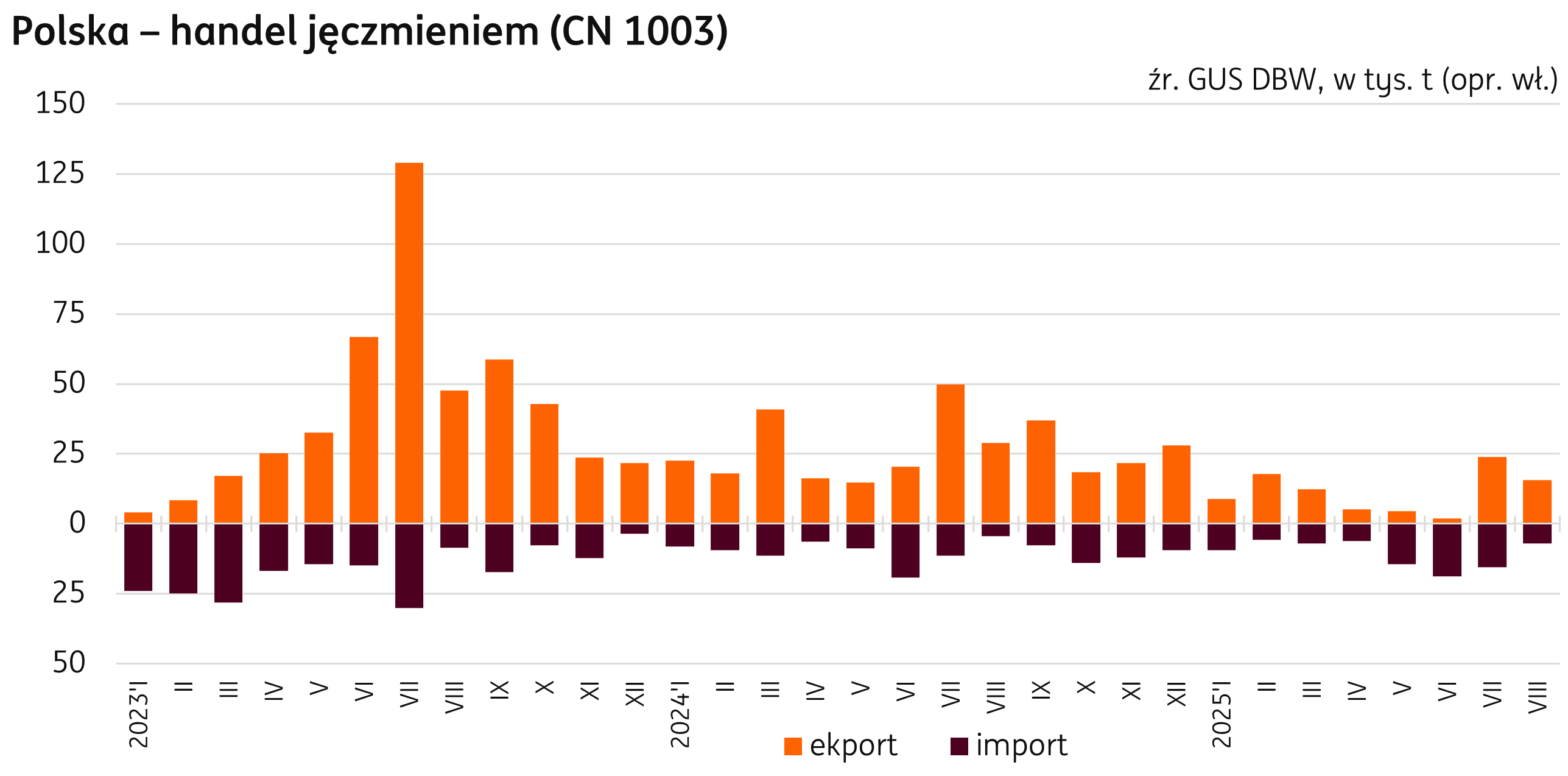 Handel. Po dwóch miesiącach sezonu 2025/26 eksport jęczmienia kształtował się na poziomie 40 tys. t, o połowę poniżej poziomu ubiegłorocznego. W sierpniu eksport jęczmienia był niższy o 46% od ubiegłego z tego okresu, osiągając 16 tys. t. Import od początku sezonu jest wyższy niż w ubiegłym roku z wolumenem 22 tys. t (+42% r/r), a tylko w sierpniu osiągnął 7 tys. t, o 58% powyżej poziomu ubiegłorocznego.