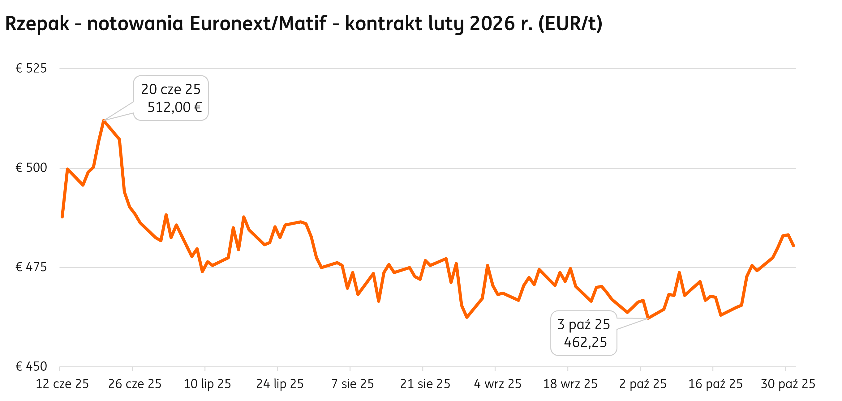Rzepak kształtował na Euronext/Matif kształtował się stosunkowo stabilnie przez ostatnie tygodnie. Przyśpieszenie nastąpiło w ostatnim tygodniu października. Ostatnie dni miesiąca pozwoliły kontraktowi na luty przekroczyć barierę 480 EUR. W stosunku do danych sprzed miesiąca ceny są o niespełna 3% wyższe. Pomimo ostatnich wzrostów aktualne ceny są blisko 10% niższe niż przed rokiem (zob. tab.).