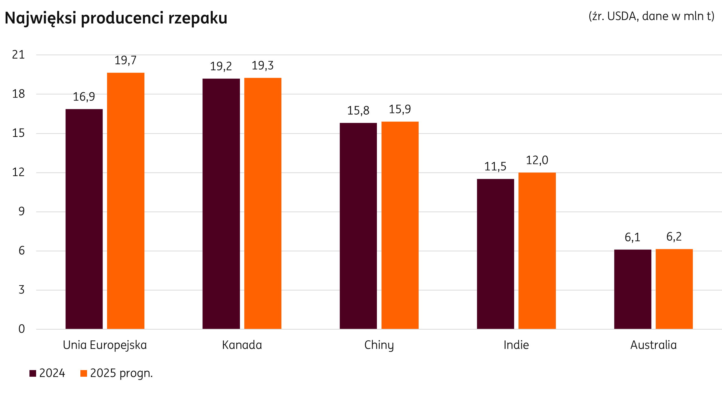 Świat: Wrześniowa aktualizacja Departamentu Rolnictwa USA (USDA) dotycząca sezonu 2025/26 charakteryzowała się niewielkimi wzrostami głównych wartości upraw rzepaku. W porównaniu z wcześniejszymi danymi, nieznacznie zwiększyła się oczekiwana produkcja (aktualizacja w Kanadzie z 19,25 do 20 mln t), jak i areał oraz wydajność. W dalszym ciągu bieżący zbiór rzepaku pozostaje wyższy niż w ubiegłym okresie 2024/25 (zob. tab.). Największy przyrost procentowo i wolumenowo jest w krach Unii Europejskiej (19,65 mln t vs. 16,86 mln t w zeszłym roku, to wzrost o niemal 17%).