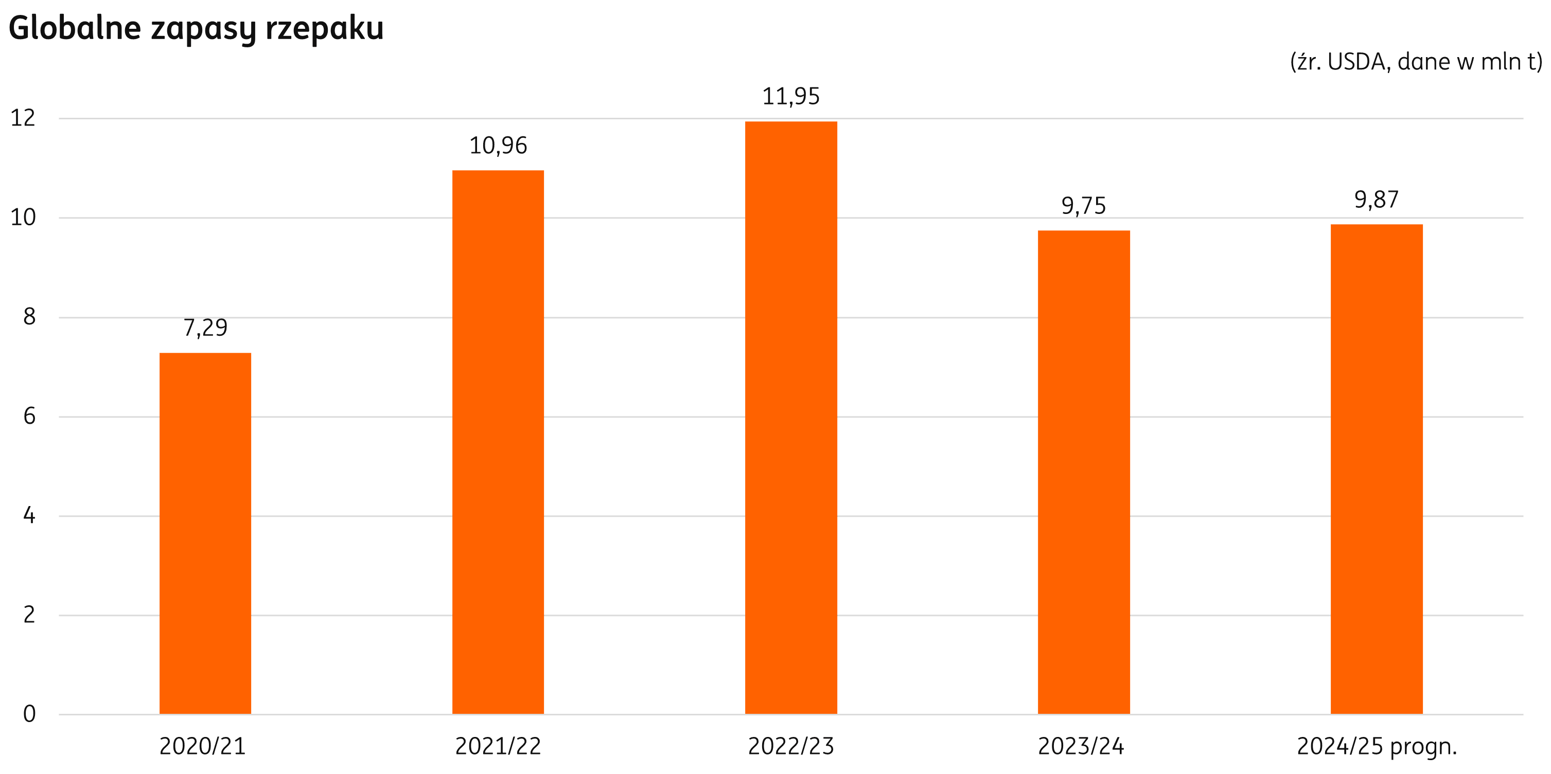 We wrześniowej aktualizacji danych miesiąc pociągnął za sobą kolejną podwyżkę wolumenu zapasów końcowych. Prognoza zapasów końcowych we wrześniowej publikacji USDA została podwyższona o ponad 15%. Wolumen jest też wyższy niż w sezonie 2024/25 (blisko 10%). Wzrost jest skumulowany w głównie w Kanadzie (z 1,5 do 3,0 mln t). W sierpniu Chiny nałożyły wstępne cła antydumpingowe na import rzepaku z Kanady. W połączeniu z wcześniejszymi cłami (nałożonymi w marcu 2025 r.) na śrutę rzepakową i olej rzepakowy z Kanady, Chiny aktualnie utrzymują zaporowe cła na wszystkie kanadyjskie produkty rzepakowe. Kanada dostarczała większość chińskiego importu śruty rzepakowej do maja 2025 r., kiedy to wpływ ceł stał się odczuwalny. Od czasu wprowadzenia ceł na śrutę rzepakową w marcu, Indie stały się największym dostawcą śruty rzepakowej do Chin.