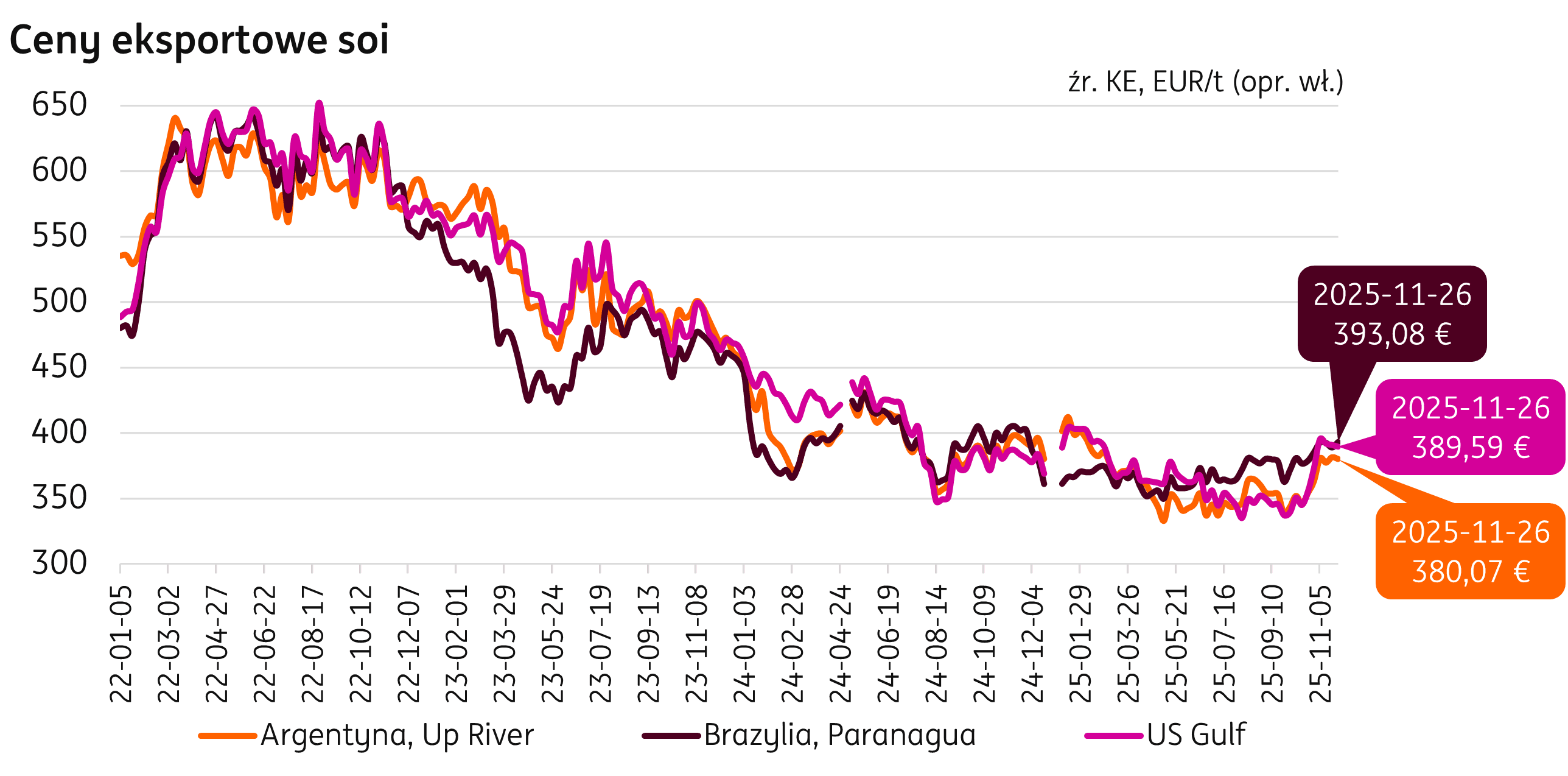 Ceny soi i śruty sojowej. Przedostatni tydzień listopada 2025 r. kończy się wzrostem cen w ujęciu miesięcznym we wszystkich trzech analizowanych portach. Notowania soi wzrosły w listopadzie w USA (Gulf) do 390 EUR/t, o 2% powyżej cen z końca listopada i o 2% ponad poziom ubiegłoroczny (dane zgodnie z raportami KE). Cena w Brazylii (Paranagua) podniosła się o 2% w ciągu miesiąca, do poziomu 393 EUR/t (-2% r/r), natomiast w Argentynie (Up River) do 26 listopada 2025 r. cena osiągnęła 380 EUR/t (+5% m/m; -3% r/r).