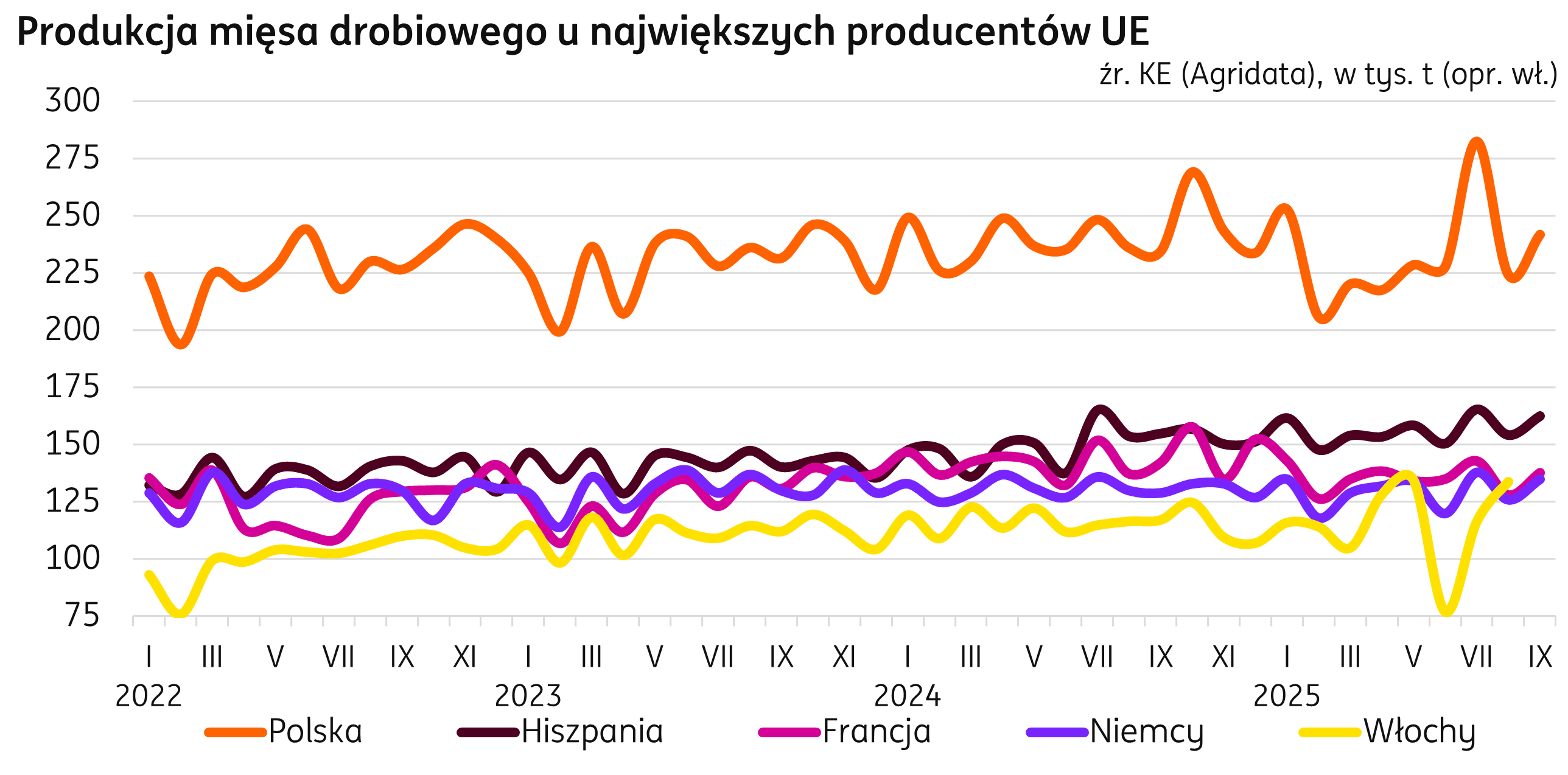 Unia Europejska. Niemal wszyscy najwięksi producenci drobiu w UE notują spadki po trzech kwartałach 2025 r. W okresie I-IX 2025 r. polska produkcja mięsa drobiowego to 2 102 tys. t (dane wstępne wg Agridata), o 2% poniżej produkcji ubiegłorocznej (-44 tys. t r/r), produkcja zmniejszona była również we Francji, do 1 220 tys. t (-4% r/r, -57 tys.t r/r) oraz w Niemczech, do 1 167 tys. t (-10 tys. t r/r, -1% r/r). Wyróżnia się drugi co do wielkości producent drobiu w UE - Hiszpania, w tym kraju produkcja wzrosła do 1 408 tys. t, o 5% r/r (+64 tys. t r/r). Na dzień publikacji raportu nie wszystkie dane zastały zaktualizowane na portalu Agridata (w tym o produkcji włoskiej we wrześniu).