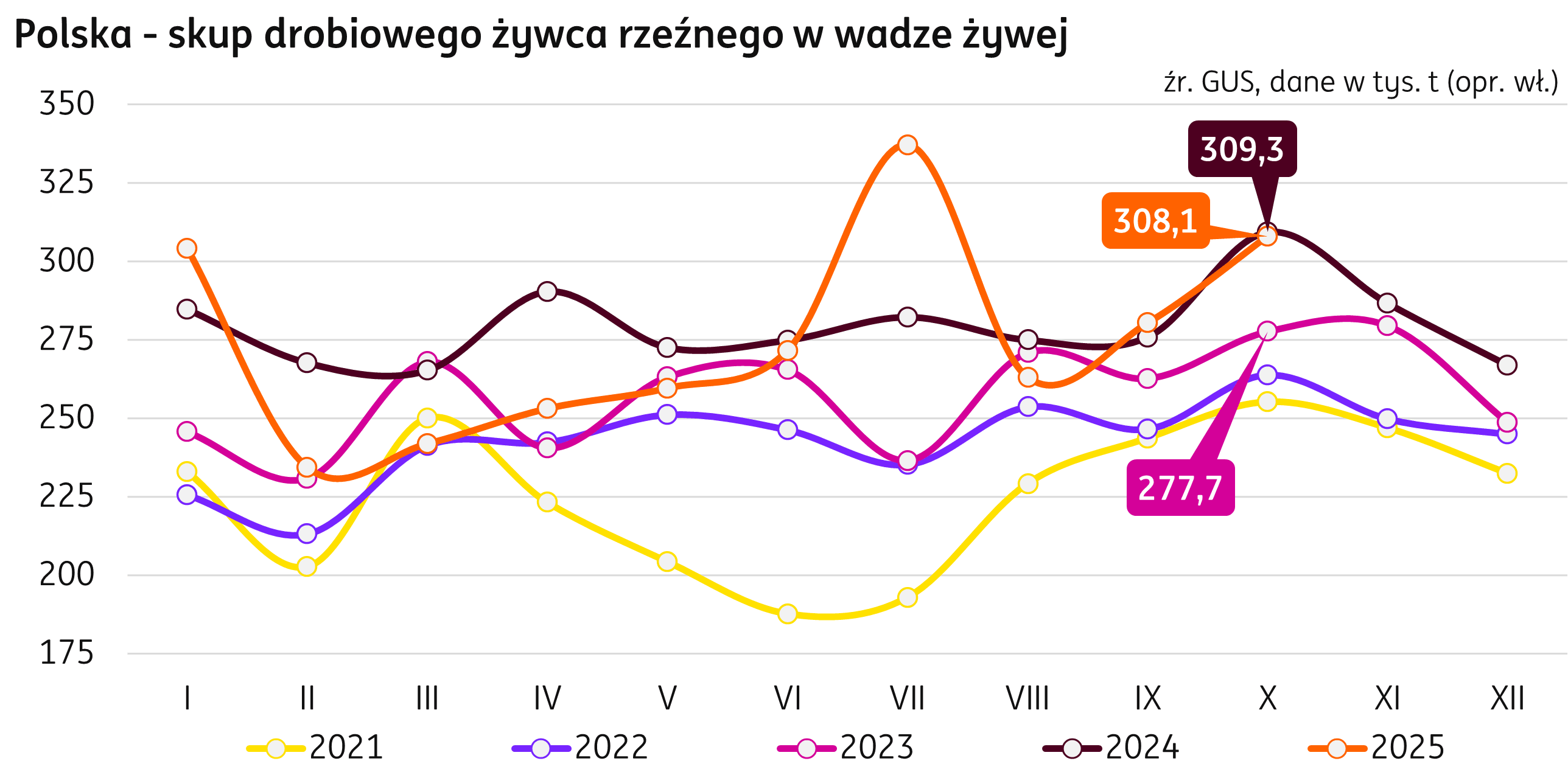 Produkcja. Skup drobiowego żywca rzeźnego po dziesięciu miesiącach 2025 r., zgodnie z danymi Biuletynu Statystycznego GUS, kształtuje się na poziomie 2 956 tys. t w wadze żywej – to spadek o 2% w relacji do analogicznego okresu ubiegłego roku (-47 tys. t r/r). W październiku produkcja była na nieznacznie niższym poziomie w porównaniu rocznym, a skup osiągnął wolumen 308 tys. t, o 0,4% poniżej tego z października 2024 r (-1,2 tys. t r/r).